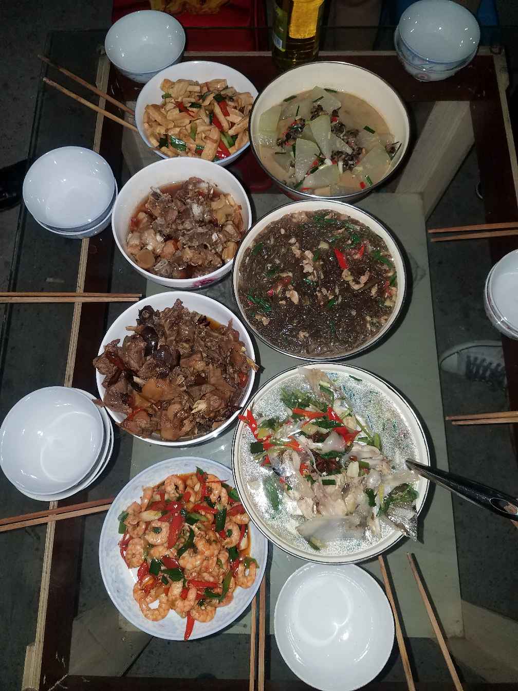 今天午饭,婆婆做了10个菜,我只拍了7个,因为还有三个没上,我们就开始吃饭了,只有公公婆婆在厨房忙,等他们来吃的时候,有的菜都吃完了