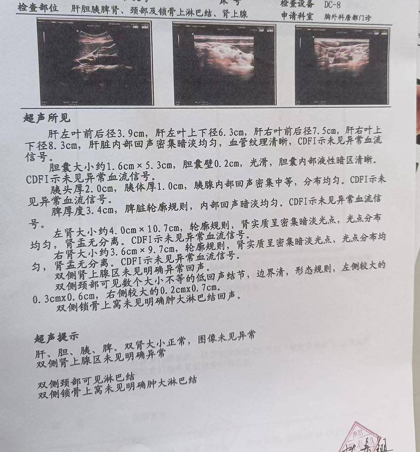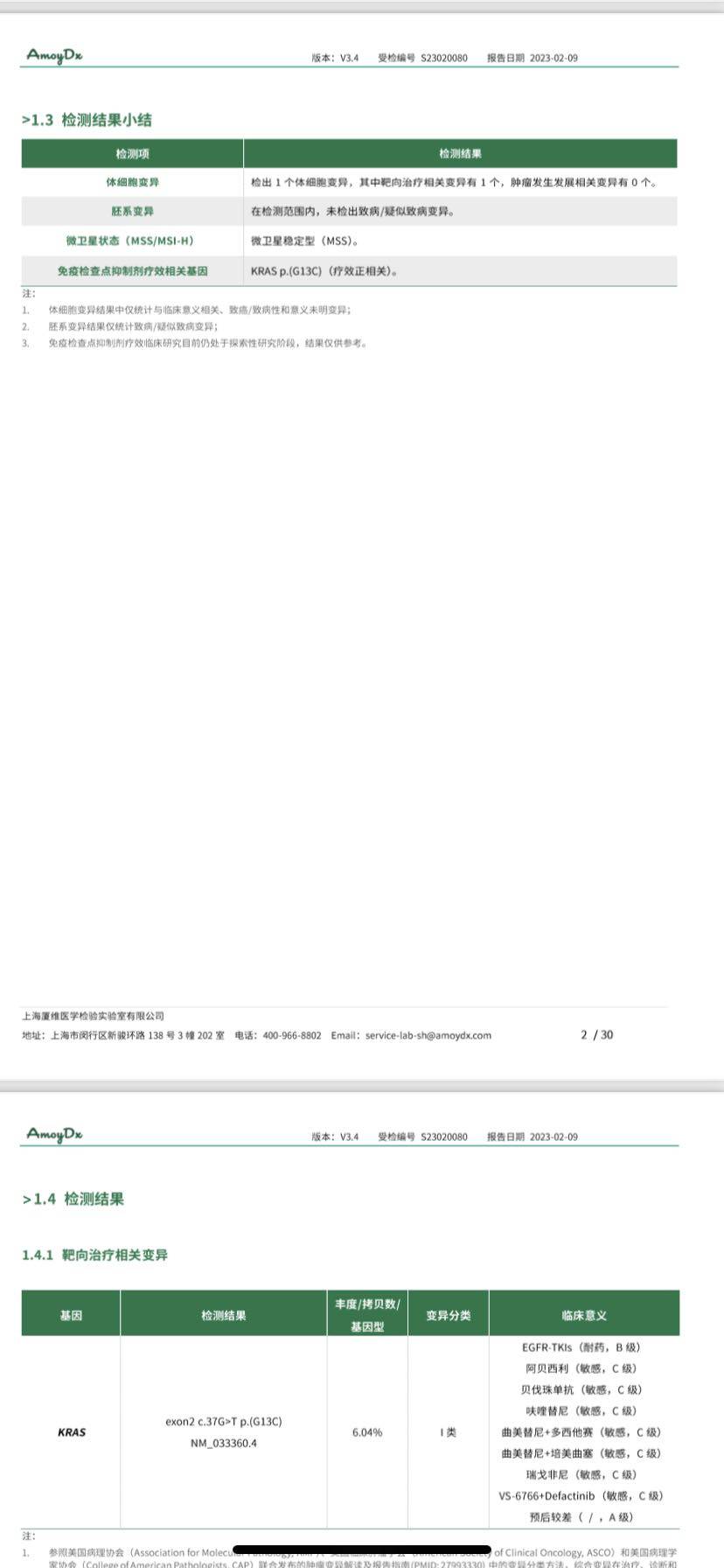 2.18:又是失望的一天,艾德生物做的血液基因检测显示只有KRASg13c突变,丰度6.07%。医生说没有靶向药吃。然后开了单子做复查。做了腹部彩超