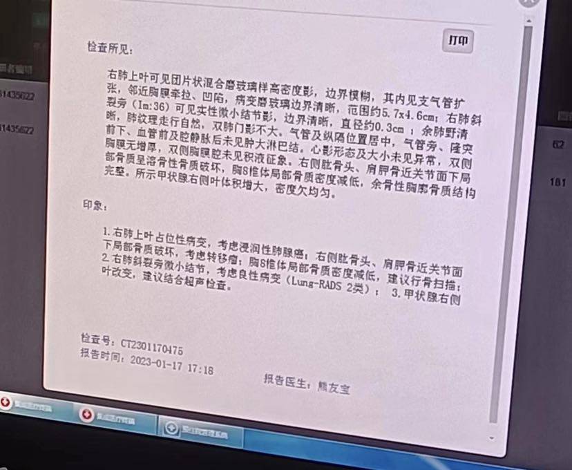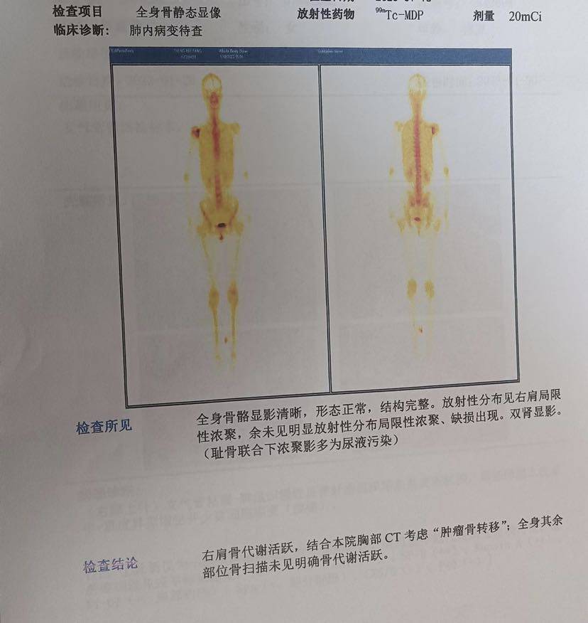 妈妈肩膀疼了快半年了,三年前肩膀摔过,一直以为是后遗症就没在意,妈妈一直自己找的中医扎针灸,但是没有好转反而越来越疼,在当地市医院拍肩膀ct的时候看到右肺上叶有病变。第二天去西安唐都医院重新检查确诊为肺腺癌,右侧肩膀骨转移,但不幸中的万幸其他器官无转移,也无积液。