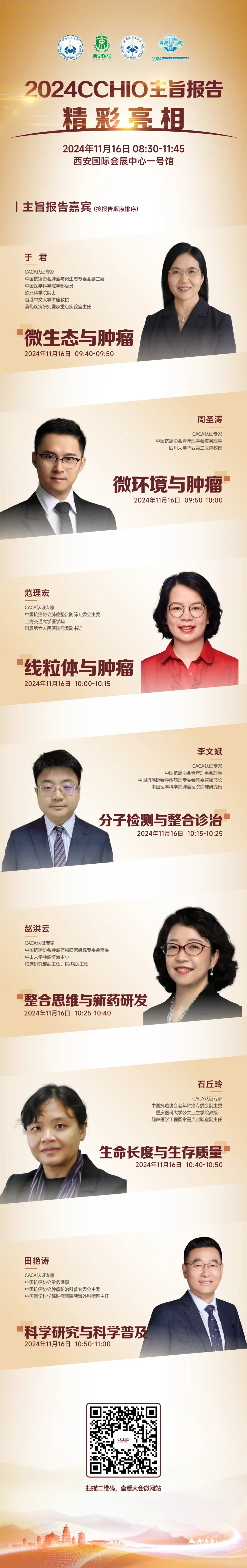 为深入展现中国智慧和中国方案,以及呈现中国在肿瘤防治领域的坚定决心和国际视野,中国抗癌协会每年都精心组织全国范围内的主旨报告遴选活动。经过激烈的竞争和严格的评选,2024 CCHIO将迎来7位杰出专家展示他们的研究成果。同时,7位学术界的院士,将担纲主持,为这些精彩的报告提供深刻的见解和专业的解读。