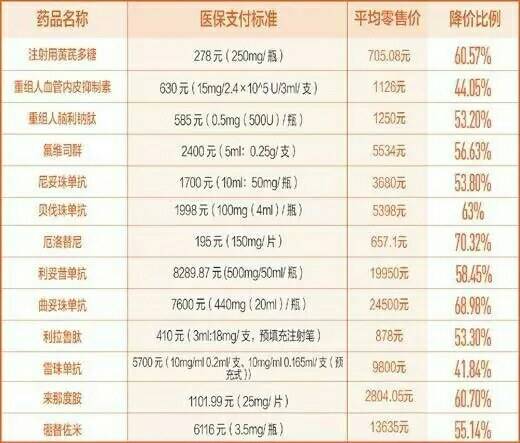 据了解,此前这些药品临床价值高但价格较贵,患者负担重。如乳腺癌靶向药曲妥珠单抗,2016年国内市场价格约为每单位24500元。此次谈判后,曲妥珠单抗进入医保药品目录后的支付标准降至每单位7600元,降幅约为69%。考虑到进入乙类目录后,医保基金将支付70%多的费用,患者个人负担的费用进一步减轻。