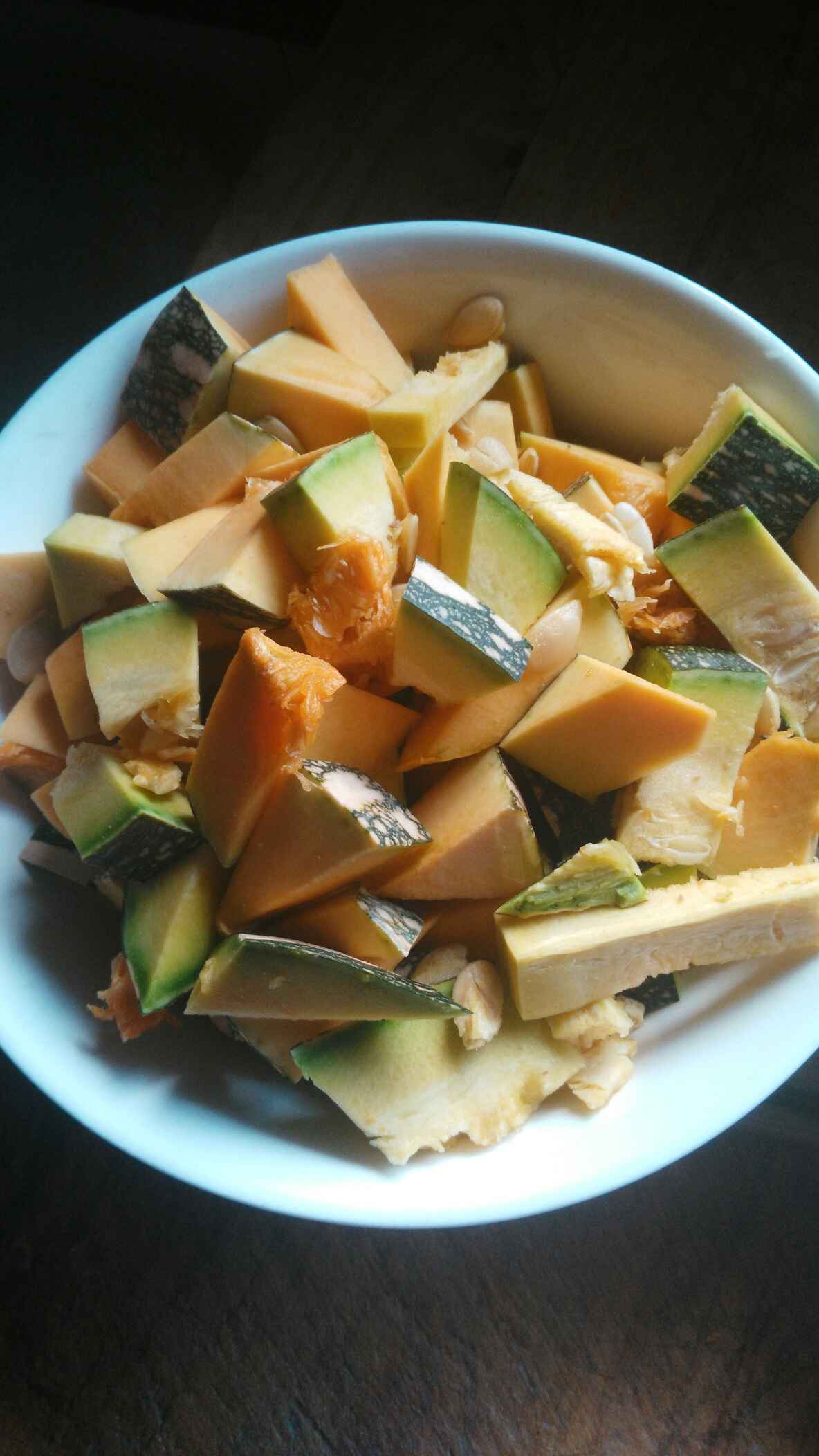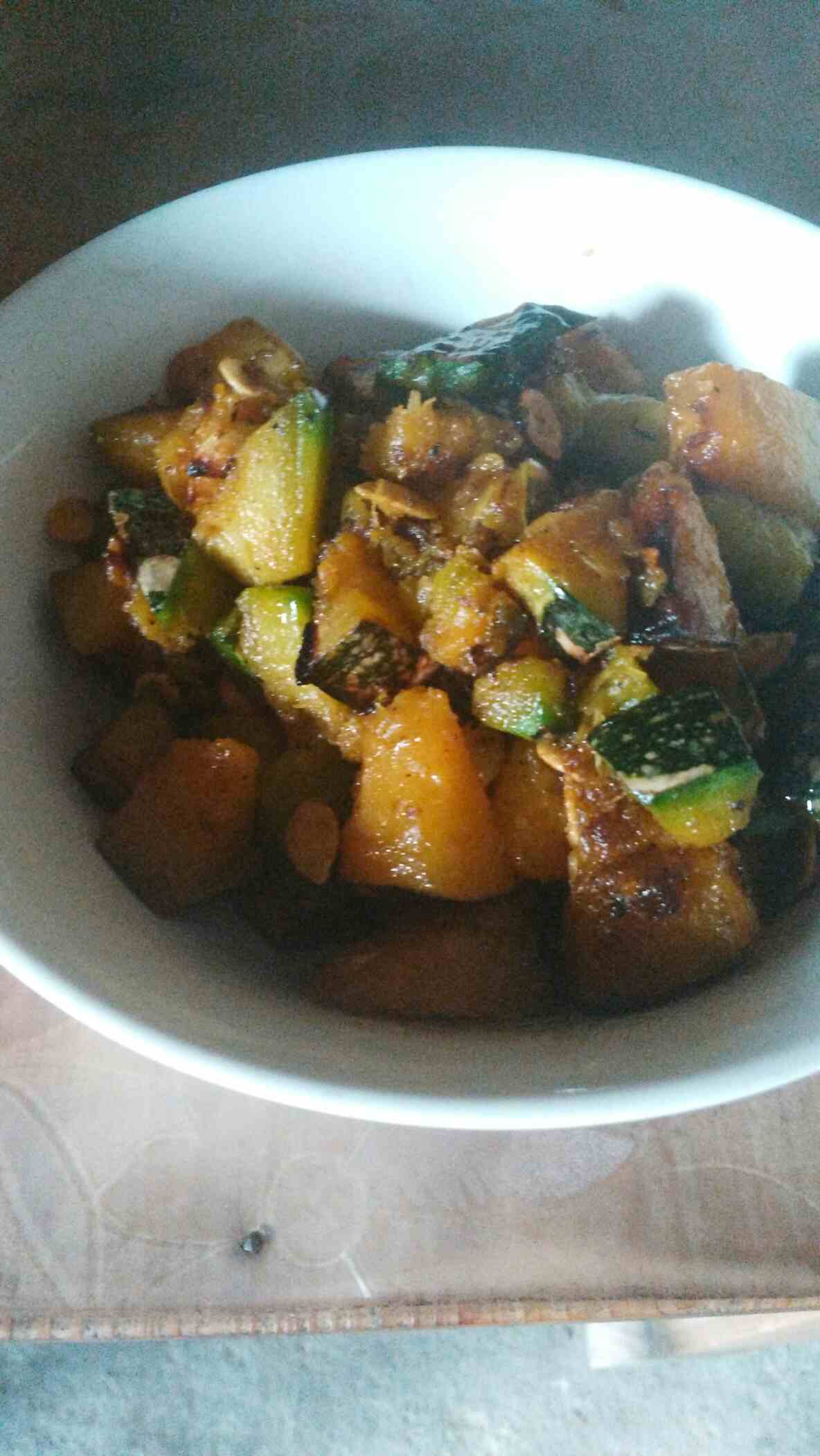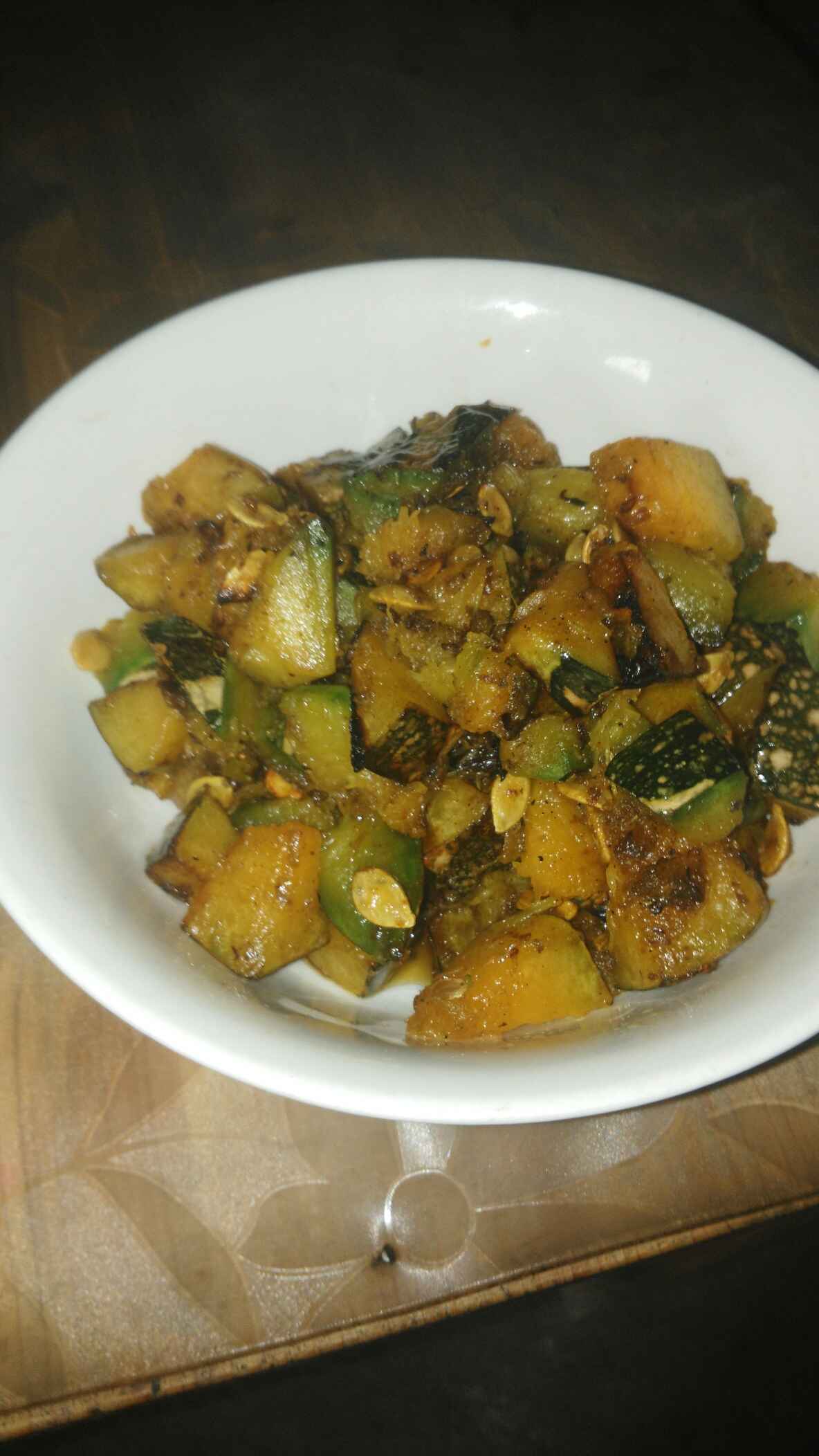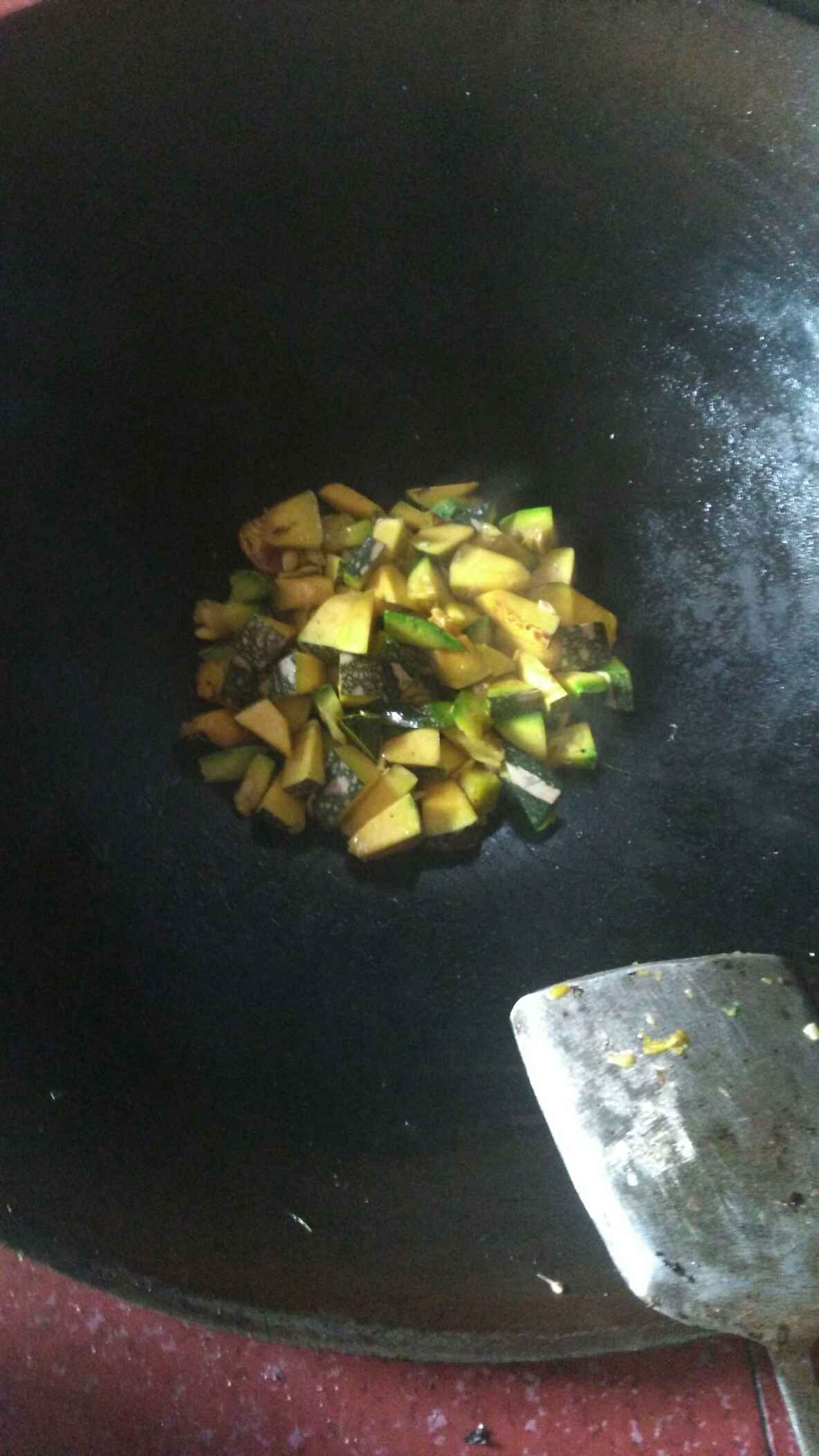 油焖南瓜。。南瓜是自个家种的。首先把南瓜切块,接着锅里放油,再放南瓜,随便炒几下,放调料,然后调成小火,盖上锅盖,直至焖熟,期间要翻炒几下。切记不要加水下去。。。。(一定要小火,不然会焦掉)