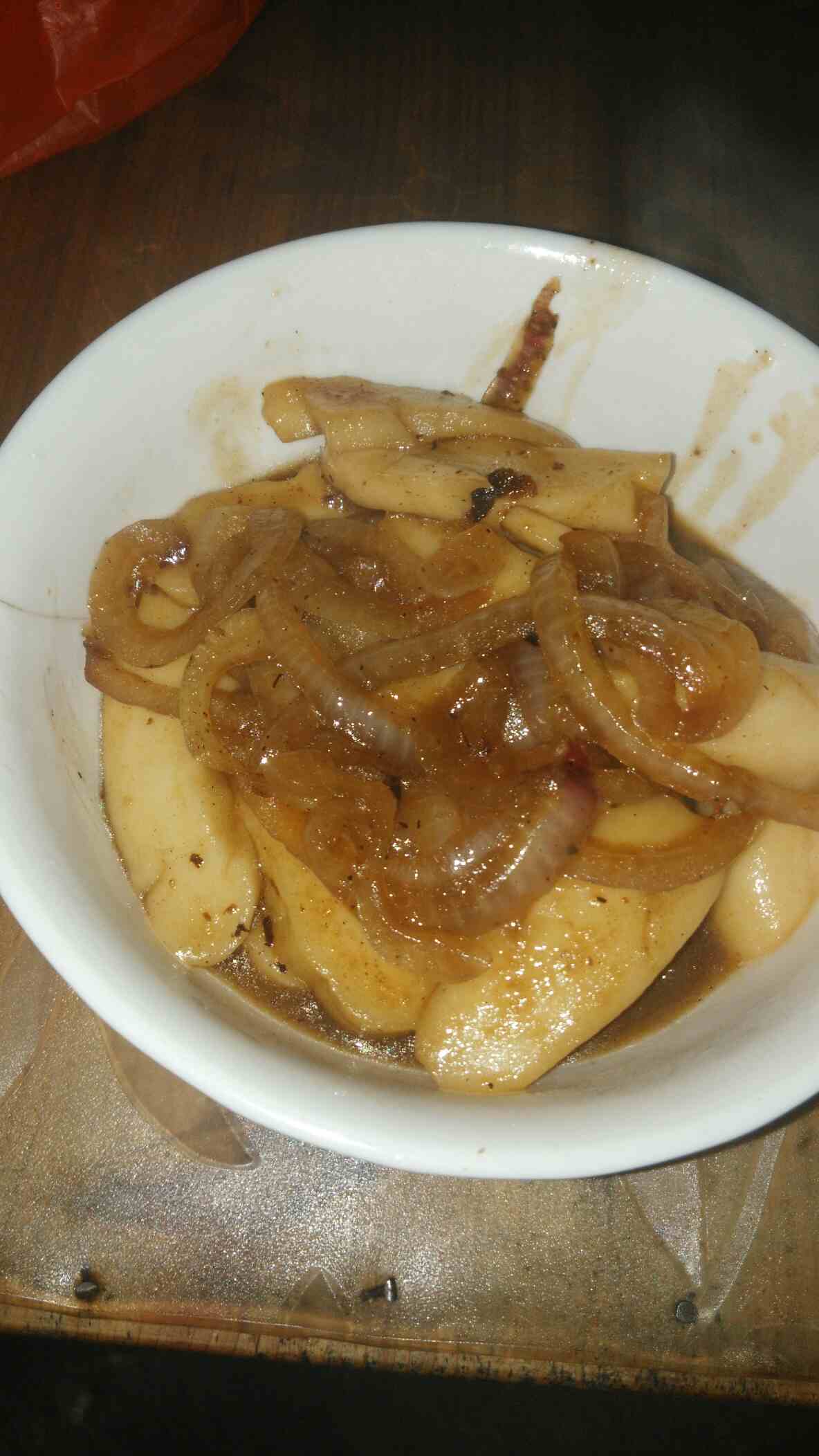 洋葱炒白果。。这是我最喜欢吃的一道,把白果和洋葱切好,下油锅一起翻炒,然后加入酱油,翻炒几下,再加点水,翻炒至白果软下来,就可以出锅啦😄特别下饭呢😊