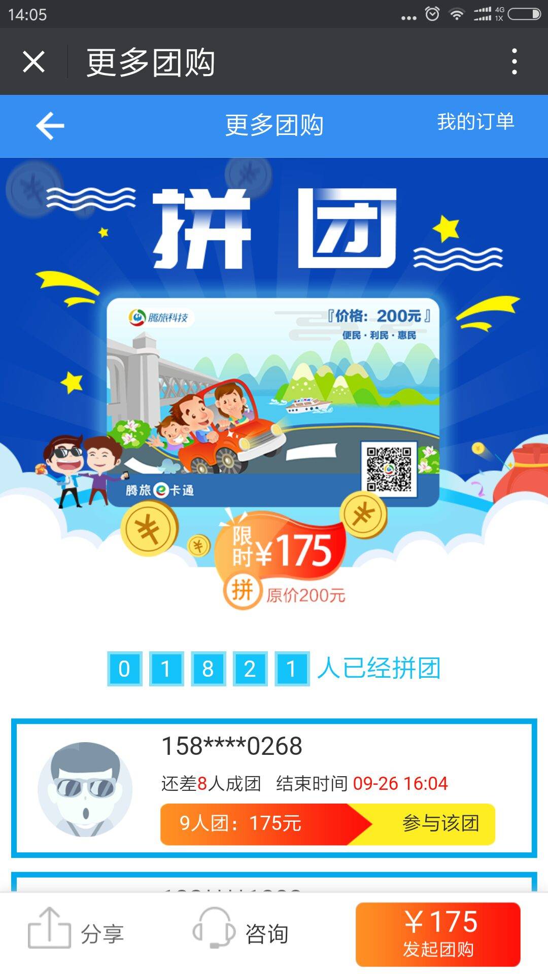 今天早上花了两个多小时时间在腾旅网上买了武汉市的旅游年卡。拼团9人成功,原价200元一张的卡只需175元。我开了10个团,在群友帮助下,完成9团,有一个一人团被系统拼团成功,总算完成了大家交办的任务,累死了。