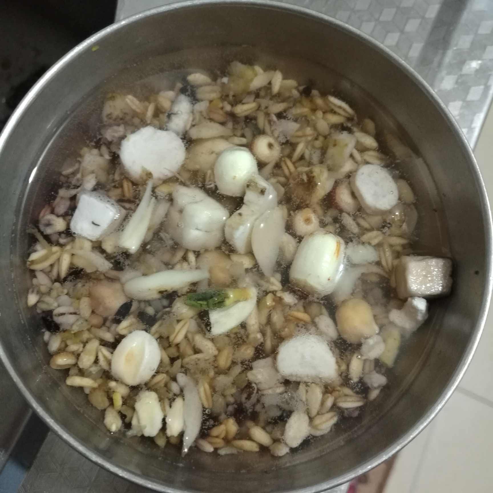 2、鹰嘴豆,芡实,荞麦,薏仁,茯苓,红豆,绿豆,黑豆,百合,莲子,银耳。(这些都需要提前一晚上洗干净以后用水泡上,第二天早上水不要倒掉,直接倒入锅中熬粥,这样营养不丢失,然后把这些东西都用刀把它切碎放入锅中熬)