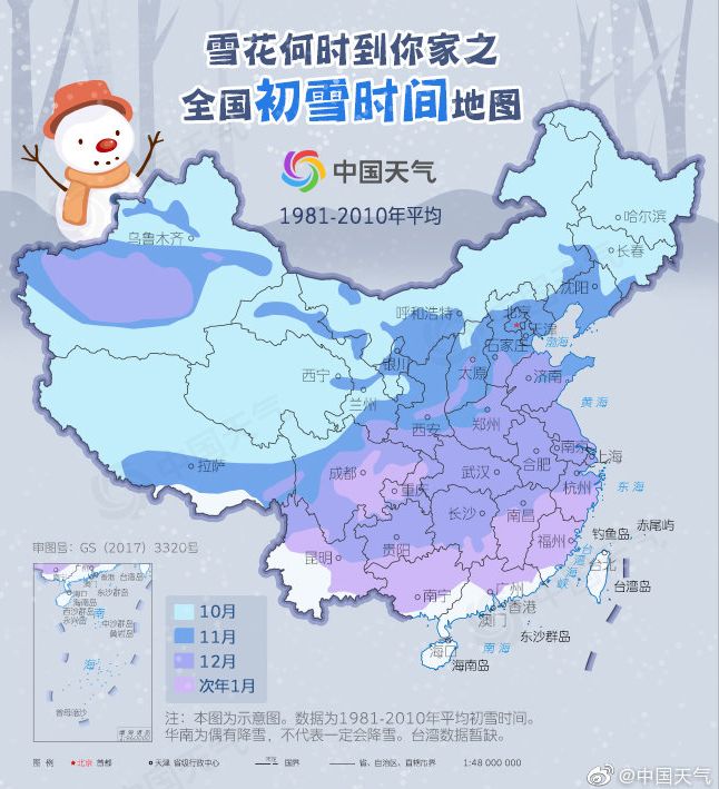下图为全国各地初雪降临的预测月份,觅友们可以根据自己的所在地方,看看什么时候降雪?应对冬天,一起准备起来吧!