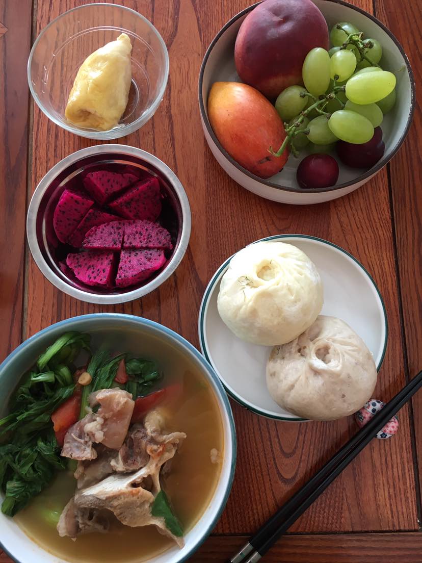 工作午餐,牛尾西红柿青菜汤,和两种不同馅料的包子。治疗结束上班这段时间,好像午餐没有叫过外卖,都是自己带饭。或者在家里带食材到公司,做一些不煎炒的食物。
