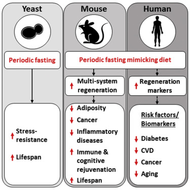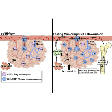 2016年,研究发现,间歇性的禁食和化疗的结合,可以减缓乳腺癌和皮肤癌的进展。综合治疗方法可使机体产生较高水平的共同淋巴祖细胞(CLPs)和肿瘤浸润淋巴细胞,后者以杀死肿瘤而闻名。同一项研究指出,短期的饥饿使癌细胞对化疗更敏感,同时保护了正常细胞,而且还促进了干细胞的产生[8]。