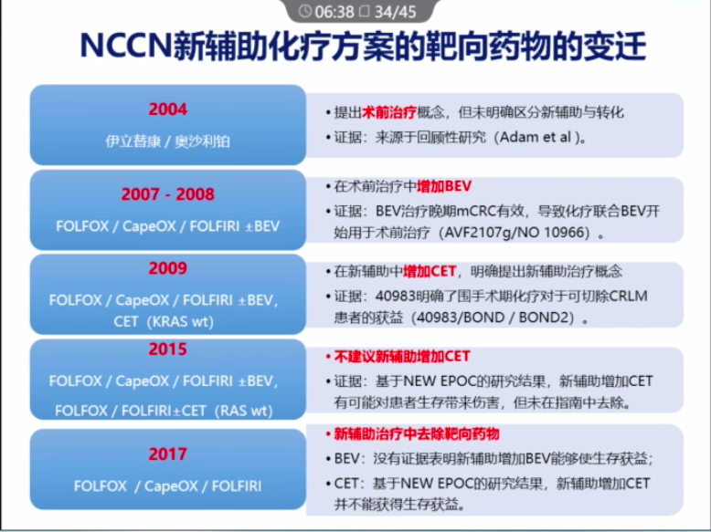 2015年,基于NEW Epoc的研究结果,指南不建议增加西妥昔单抗,而到了17年,NEW Epoc结果又指出无证据表明贝伐珠单抗可带来生存获益,即新辅助治疗去除了靶向药的使用。NEW Epoc的研究结果对指南的制定具有较大影响,也有专家也对NEW Epoc研究持不同观点。比如MD Anderson通过一项回顾性研究提出,对于≥4个或有肝外转移的可切除者,新辅助治疗可以加靶向药。
