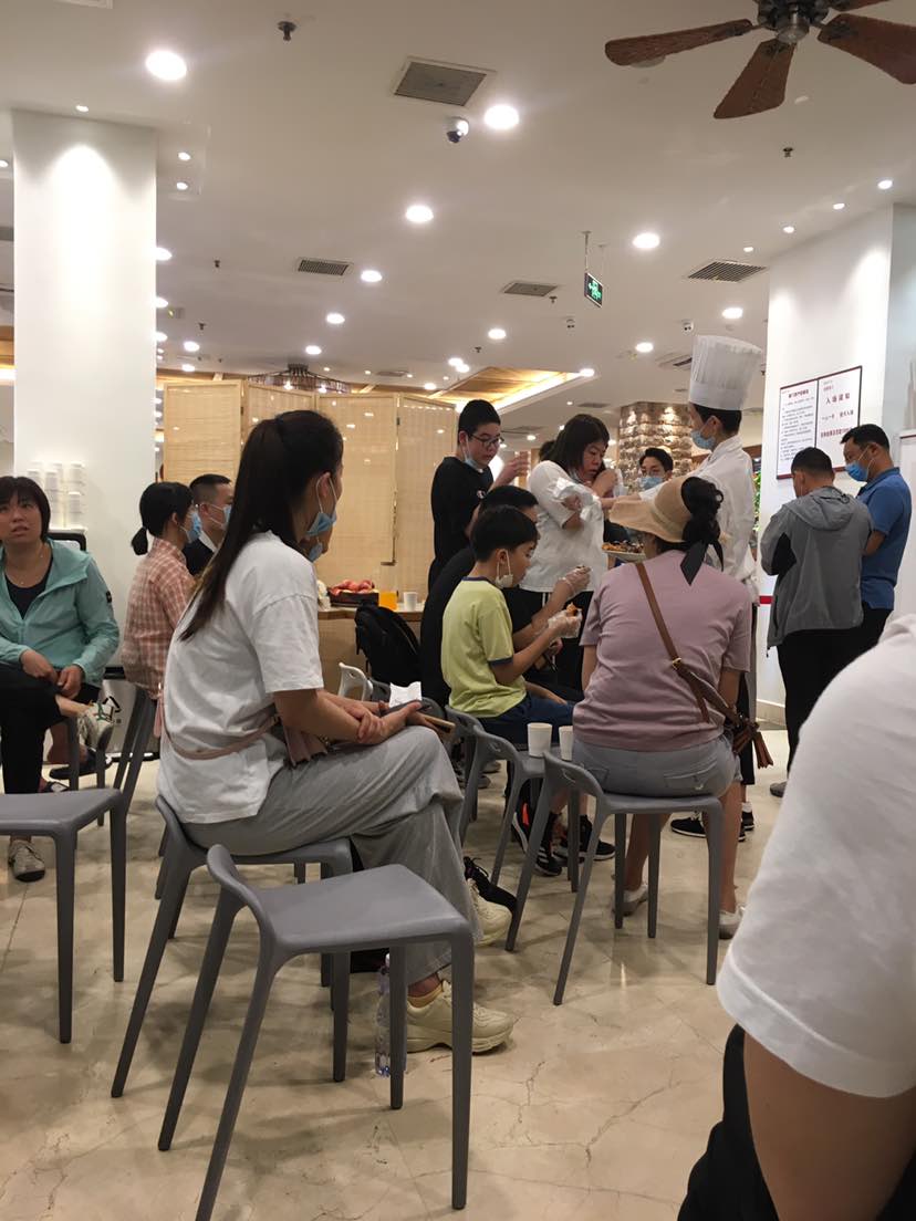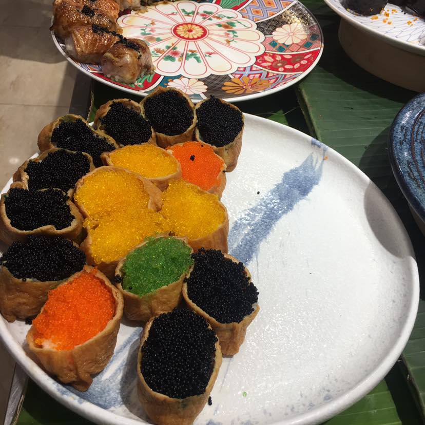 排队等位,等位的时候餐厅怕客人饿。人性化的拿出来烤鸭和寿司给客人吃。