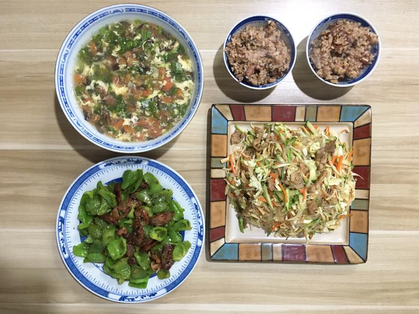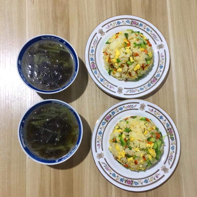 今天早餐简单,炒饭,放点黄瓜丁和胡萝卜丁,在加入鸡蛋碎。再来一个无油萝卜紫菜汤。一顿简单的早餐,所需营养全部搞定。碳水,蛋白质和维生素。