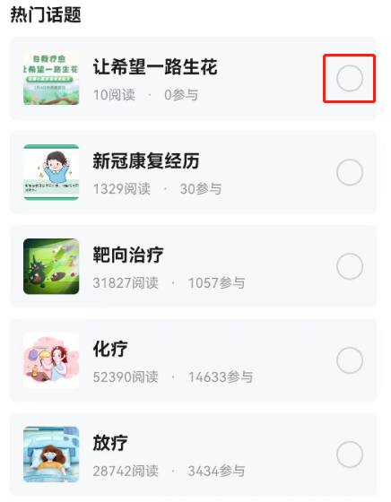 觅健App内发帖,发帖时添加话题“让希望一路生花”,描述抗癌之路的心路历程,如:患癌至今你的心态都发生了什么变化?是什么给你带来了希望?这一路上你都如何自我疗愈?你有什么经验可以分享给大家?有什么让你特别难忘的事?有什么人是你最想感恩的?等等……