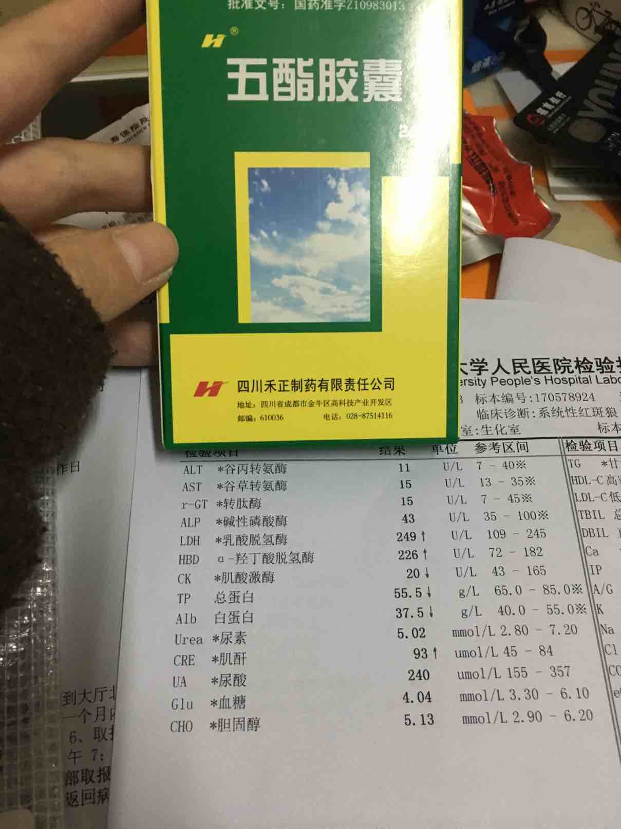 24小时尿蛋白增加了,激素就加到6颗了……还加了一个叫五酯胶囊的药,但是我看说明书治疗的是降低血清谷丙转氨酶,用于慢性迁延性肝炎谷丙转氨酶升高者……关键是我的谷丙转氨酶不高呀??我拿到药才知道这个药的作用……唉,心情不好了…白天一直在坐着,都没尿尿,水肿一直在,红细胞低,白蛋白低,白细胞高……什么时候化验单上能没有小箭头