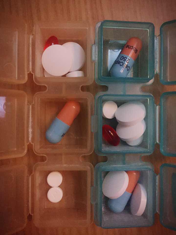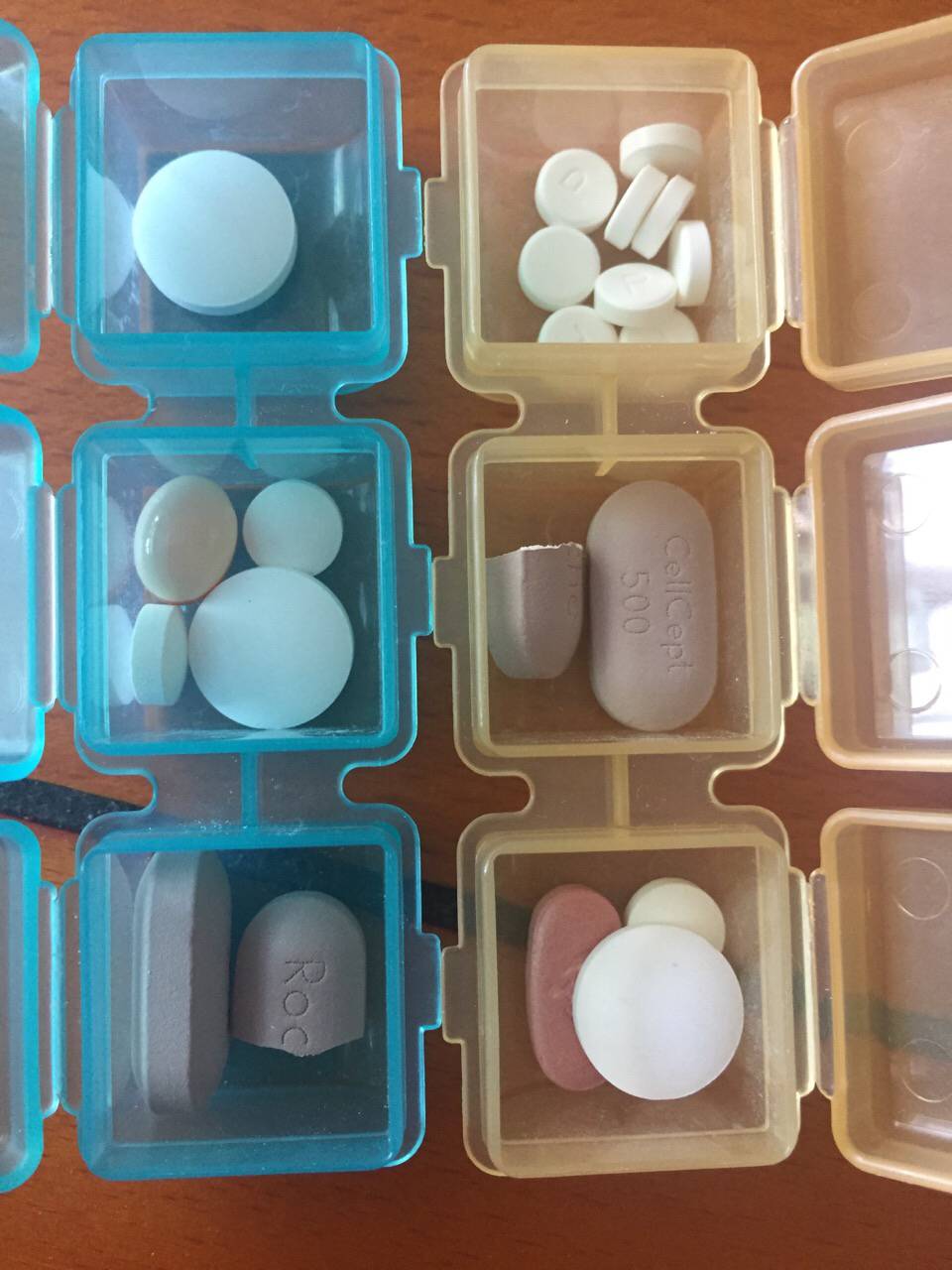 图1是一年前刚出院的时候,十片激素,胃药一片,早晚各一个半晓悉(三个胶囊),早中晚各一个钙片,早晚各两个芬乐,早晚各一个骨化三淳