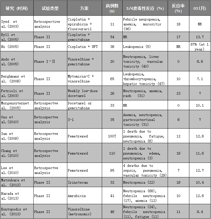 在 Morgensztern 教授等的研究当中大多数的患者都采用的是多西他赛药物的化疗,其中 33 例中的 24 例采用的是紫杉烷,其他 9 例采用的是单药吉西他滨的治疗。作者只汇报了有效的结果,没有观察到肿瘤缓解,但是在 13 例(40%)的患者中都是疾病稳定状态(SD),中位的 TTP 和 OS 分别为 2.5 个月以及大约 10 个月。