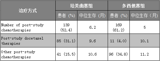 表 2. 培美曲塞对比多西他赛的试验后分析