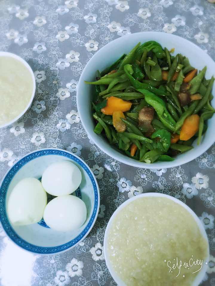 早餐:小米粥 白煮蛋(我一直吃的都是鸭蛋)长扁豆青椒胡萝卜炒肉。祝大家周末愉快!