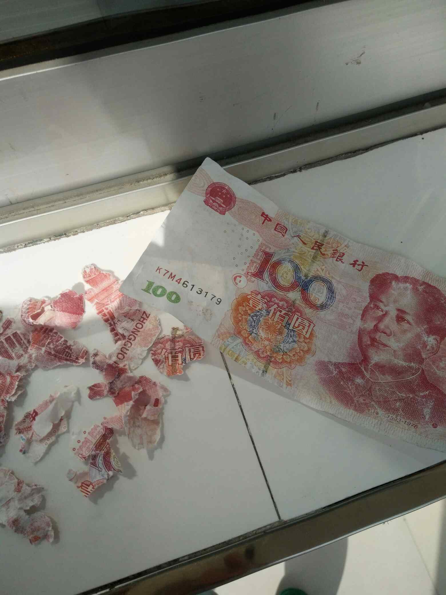 整张的那个可以去银行换一百回来,碎的能拼上就也可以换,祝你换回来哦