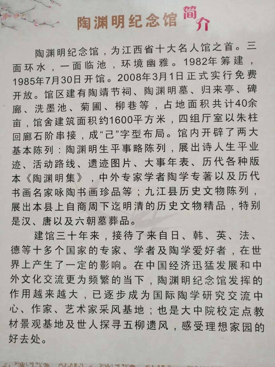 今天是二日游的第二天,一早上6.20就要到所住酒店的大厅集合,二日游,到过4个购物点,三个旅游景点,虽然导游没有强行要求购物,但这样的旅游以后也不会再参加。今天玩了二个景点,贤母园和陶渊明故居,谈不上好玩,但都有意义。发几张图片和姐妹们分享。