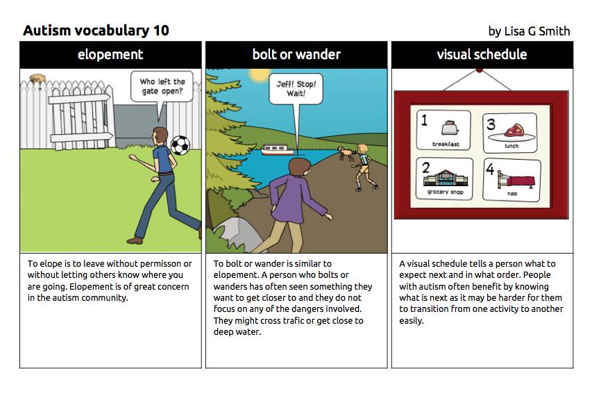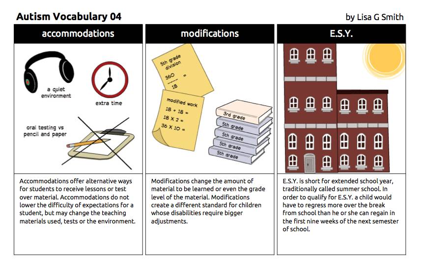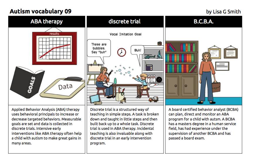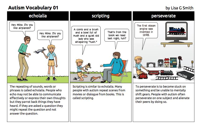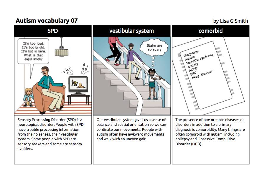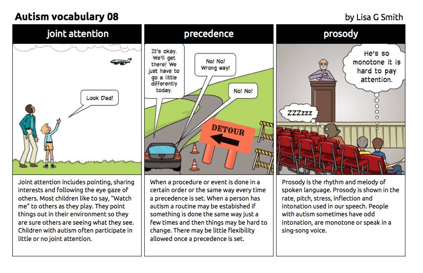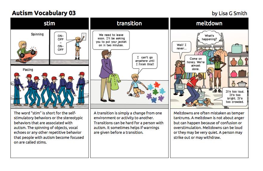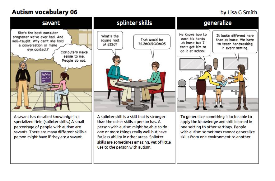 Lisa用自己对自闭症的理解画了一组图,叫自闭症词汇101,生动地再现了从自闭症特征,治疗方法和美国学校教育。