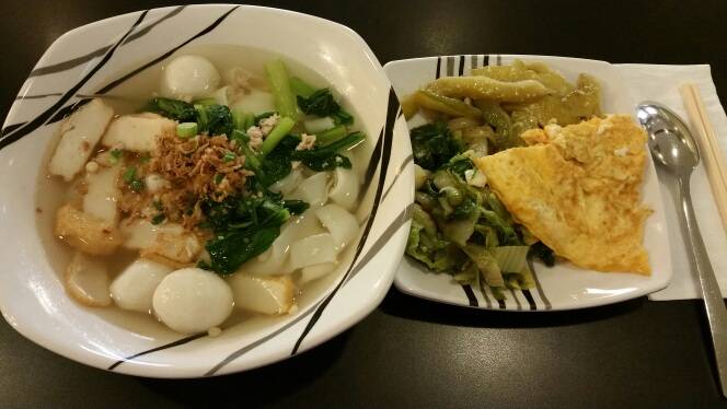 中午在食阁吃的:鱼圆餜条汤,清炒苦瓜,清炒小白菜,煎蛋~☺