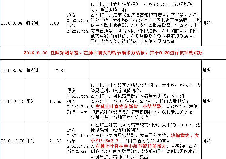 "其实在去年10.28的CT中就发现有一个新增的0.4cm的结节,当时主任对比电脑中8月份的CT时,经过鼠标放大是可以看到一丁点的结节。那时他说继续吃药观察,结节还太小,不做考虑。我考虑原发和胸膜都是正常的,同时你又有肺癌引发的继发性结核,单凭这个无法确认是什么情况。况且你那会儿心态刚刚调整过来,不想让你负担太重,故选择了隐瞒。"