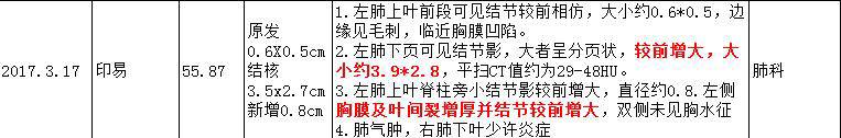 "到了今年3.17的复查,之前有段时间我感觉你痰有点多,最近好像又好点,天真的以为这次复查也许没事,所以也没催你去检查,但是复查的前一周周末回去时我发现你似乎容易咳嗽了,那时我是害怕的。拿报告那天特地叫小杨陪我去,一走进医院我就开始心慌的不行,是他拿了结果告诉我的,没想到的是这次的胸膜结节又增大了。"
