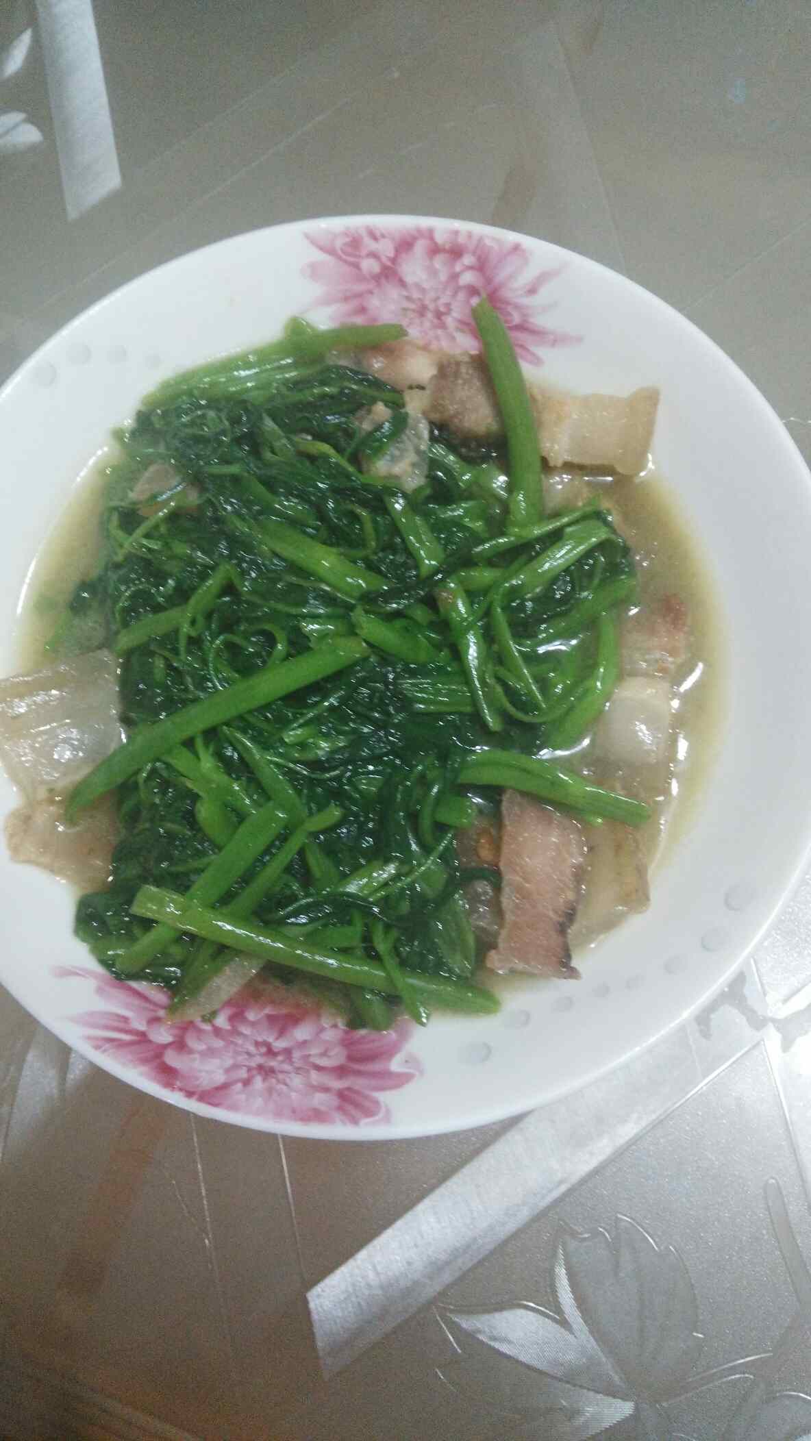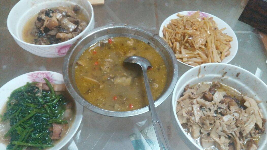 煮了干饭。再加四菜一汤。空心菜,土豆丝,春笋,木耳炖肉。汤是酸菜炖鸭汤(昨天剩的)嘿嘿😁准备齐全了,就等人回来吃了😁
