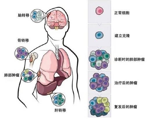 肺癌复发:该模型演示了肿瘤如何不断获得更加合适的克隆体,产生亚克隆以及最终出现肿瘤异质性的过程。