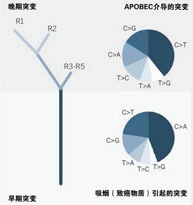 克隆演化。该图中的系统发生树为我们展示了肺癌的克隆演化过程。饼图显示了发生于肿瘤进化早期(吸烟诱导的突变)和晚期进化(APOBEC介导的)的6种类型的突变。R表示肿瘤的区域。