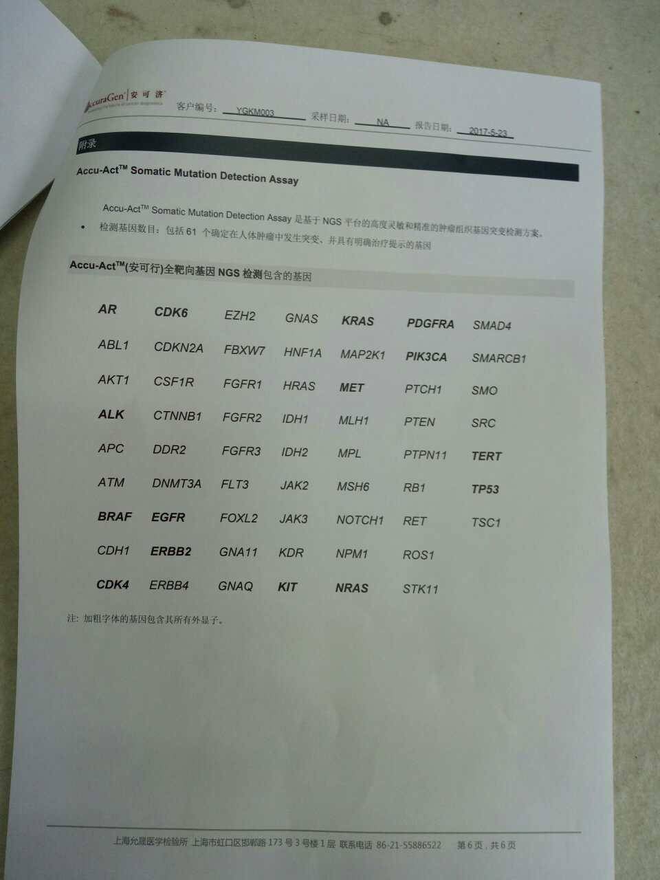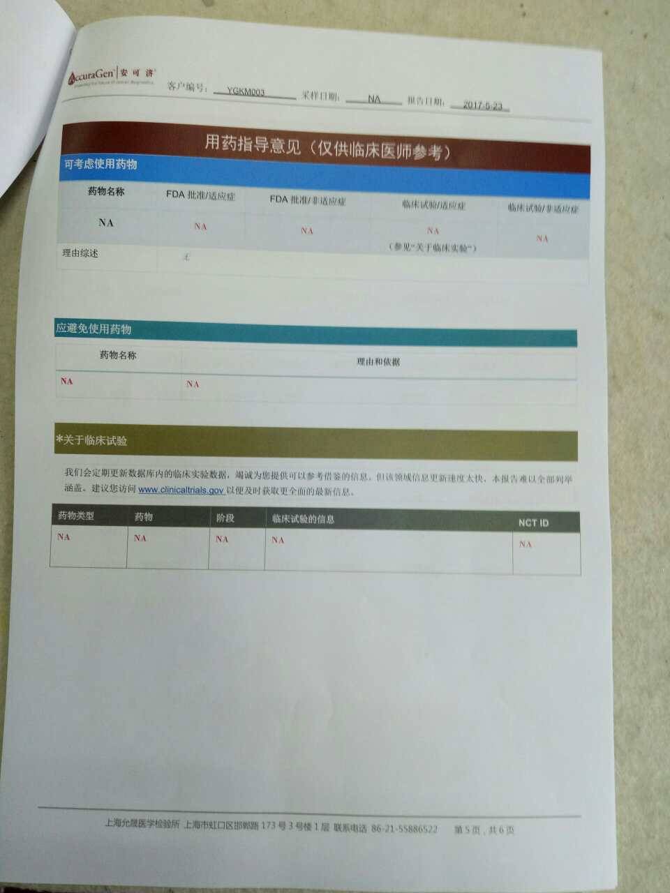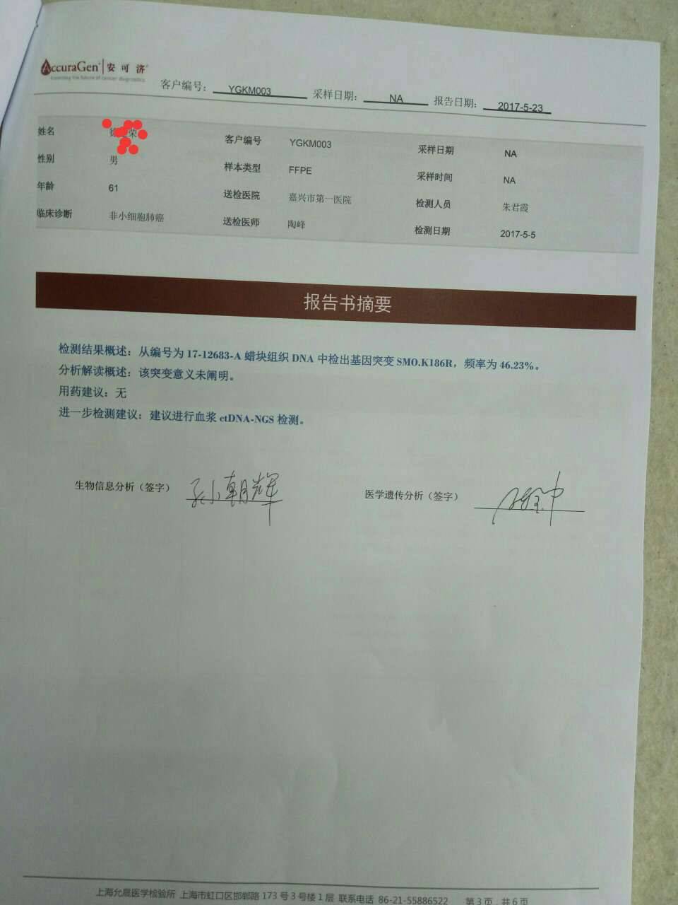 可是报告没有检测机构的章,这样的检测结果是否靠谱?作为肺癌患者家属,对这样一份报告无法判断,担心是个假报告,请教,谢谢!