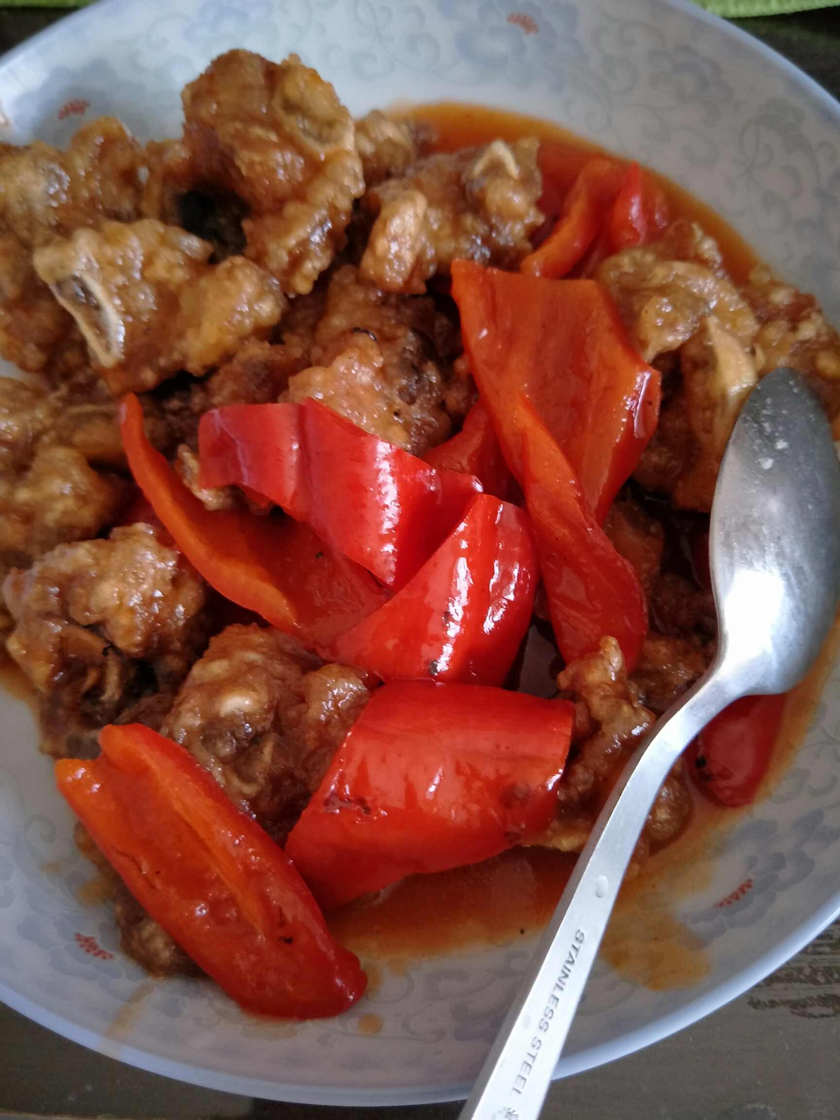 接着,最后一个环节,锅里的油,倒出来碗里,放凉,锅里还存在油的,放下红椒,爆一下,放点水,放点番茄酱,放点砂糖,煮,放点醋,如果稀了,用淀粉开点水,搅拌均匀,倒入煮好,合味的番茄酱中,翻炒至有点稠的形状,熄火,把炸好的排骨,倒入番茄酱中,翻炒至全部混有番茄酱!!