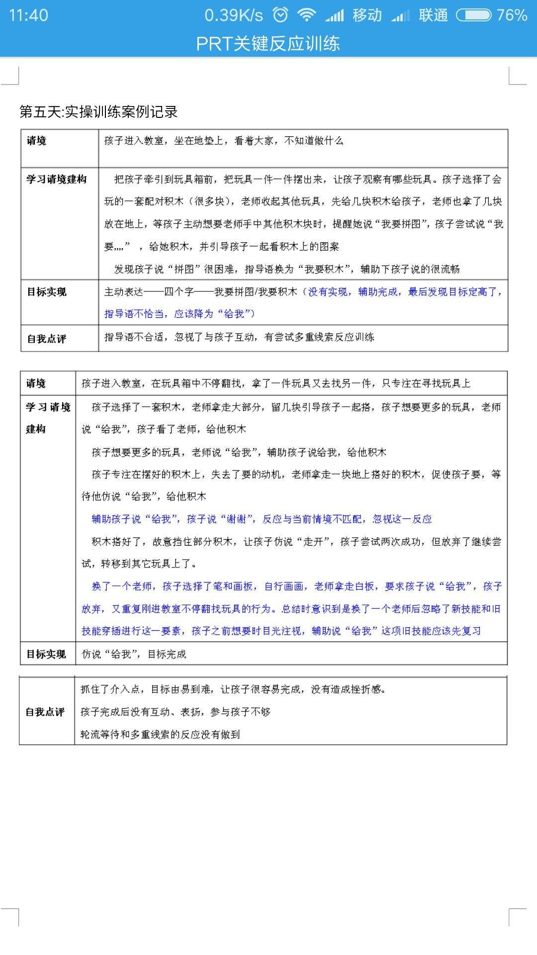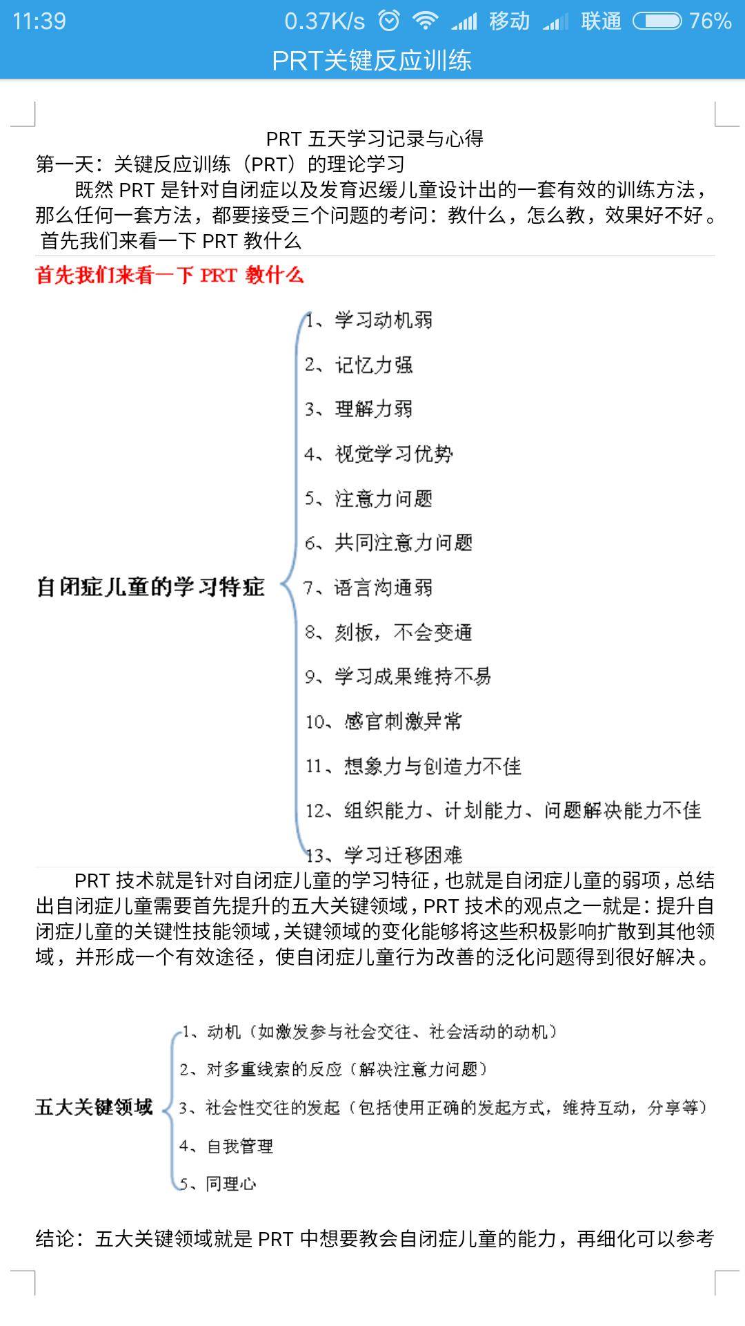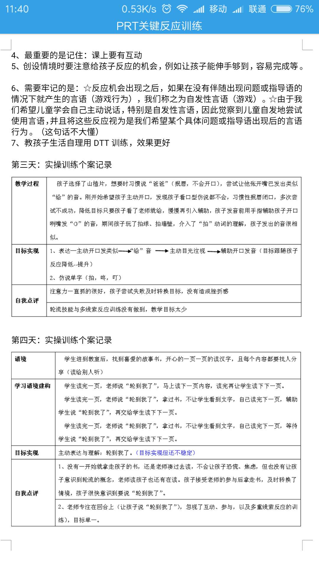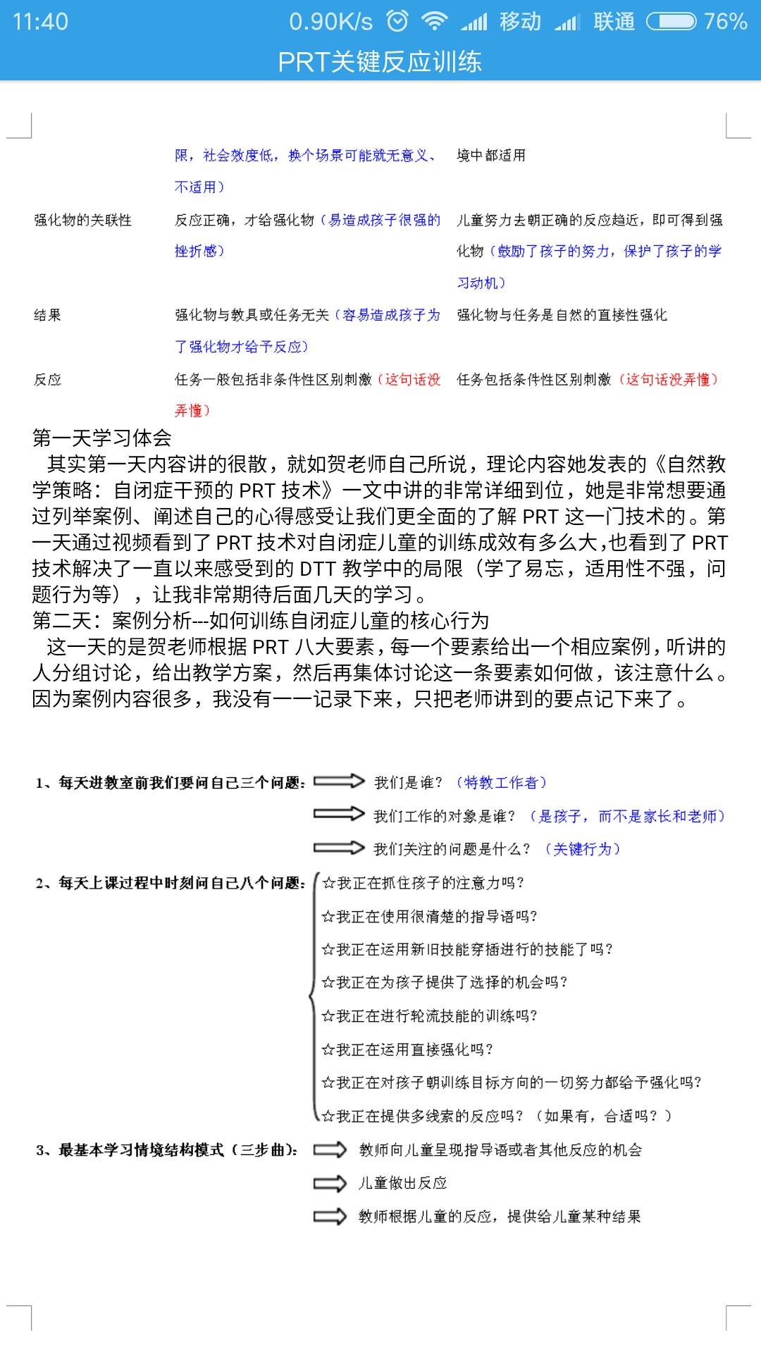 其实第一天内容讲的很散,就如贺老师自己所说,理论内容她发表的《自然教学策略:自闭症干预的PRT技术》一文中讲的非常详细到位,她是非常想要通过列举案例、阐述自己的心得感受让我们更全面的了解PRT这一门技术的。第一天通过视频看到了PRT技术对自闭症儿童的训练成效有多么大,也看到了PRT技术解决了一直以来感受到的DTT教学中的局限(学了易忘,适用性不强,问题行为等),让我非常期待后面几天的学习。