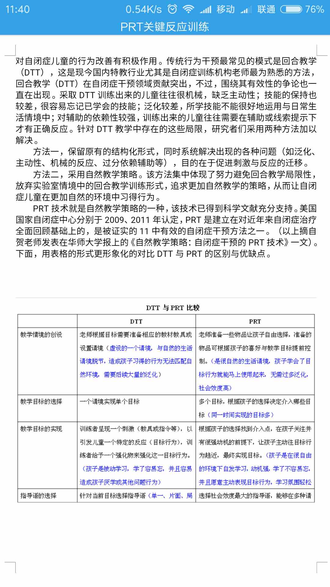 PRT技术就是自然教学策略的一种,该技术已得到科学文献充分支持。美国国家自闭症中心分别于2009、2011年认定,PRT是建立在对近年来自闭症治疗全面回顾基础上的,是被证实的11中有效的自闭症干预方法之一。(以上摘自贺老师发表在华师大学报上的《自然教学策略:自闭症干预的PRT技术》一文)。下面,用表格的形式更形象化的对比DTT与PRT的区别与优缺点。