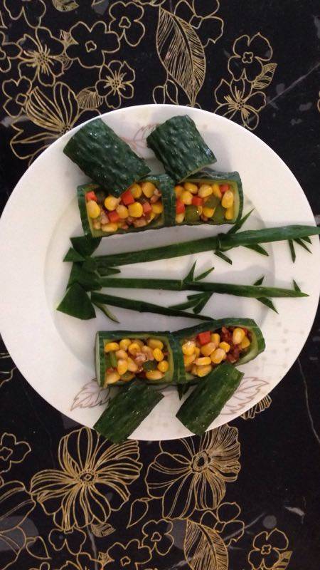 中午下班回家,又做了五彩黄瓜盅,香蕉派,五彩玉米……