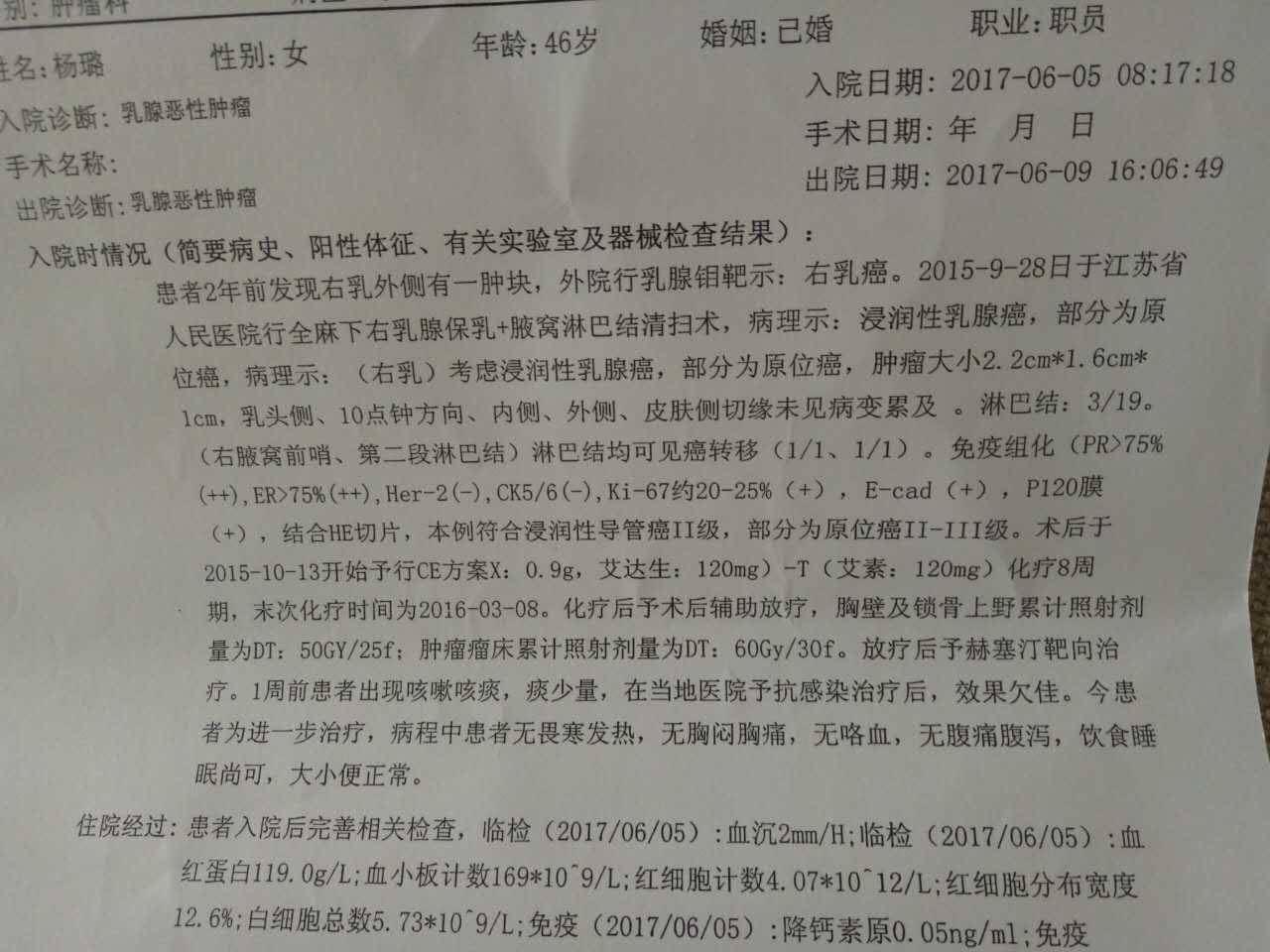 她是二阳一阴,不用靶向治疗,但要吃内分泌药。
