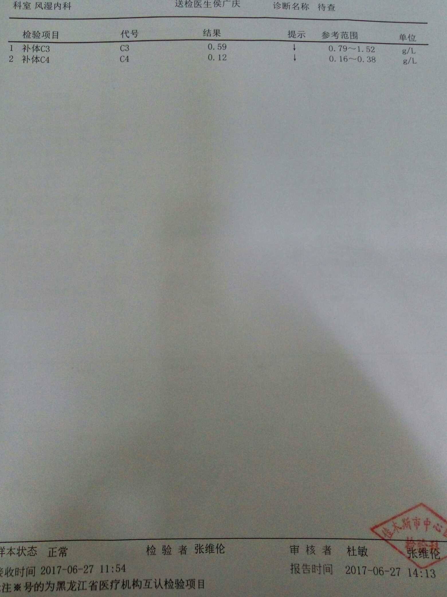 白细胞正常,说我不贫血了,C3C4补体低,医生说我还是活动期,吃的药没变,还好没加激素。过些日子中药调理。肝脾肾胃。我的脉弱。阳虚。主要我想治我的脸起红疙给自己加油