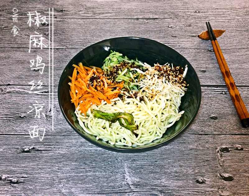 面条盛碗,铺上黄瓜丝,胡萝卜丝,鸡丝,浇上酱汁和椒麻油。