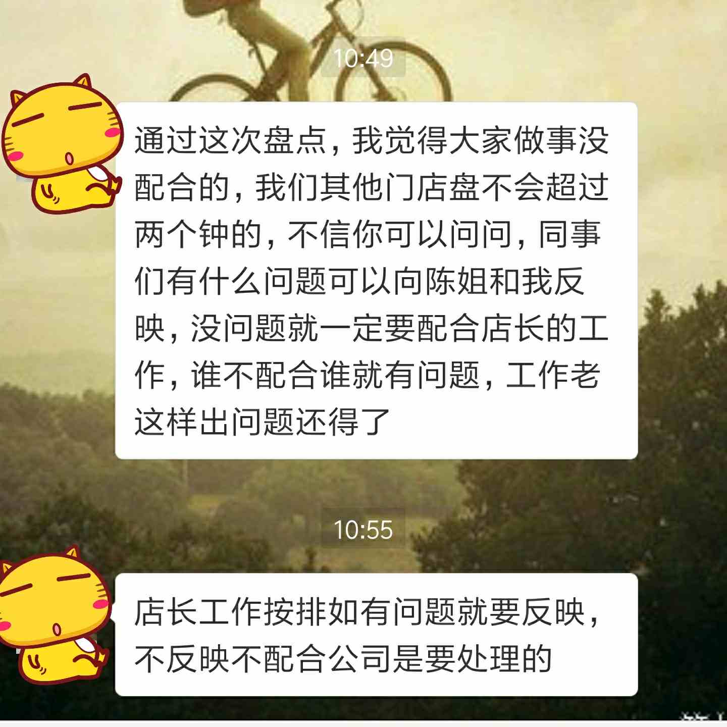 前天晚上盘点,这家店货很乱很多,库存又多。我们盘点晚上十点开始盘,预计三四点盘完的,后来盘到了早上七点多。累得像狗一样,上晚班的同事还得继续上早班,连续二十四小时上班了。然后老板说别的店一两个小时就盘好了,为什么就我们的店要盘通宵。心里拔凉拔凉的,我们也一直在做没有停也没有在玩,大晚上的谁都想盘完快点回家睡觉呀!后来今天店长拿盘点表去开会了,把责任推到我们员工身上了说是我们不配合她,叫了不做。她说十点盘点我们九点半就在那里等了,十点就准时开始了。然后还怪我们员工了。虽然说店长也是刚升上去没多久,但是我们几个也是刚去做没多久的。