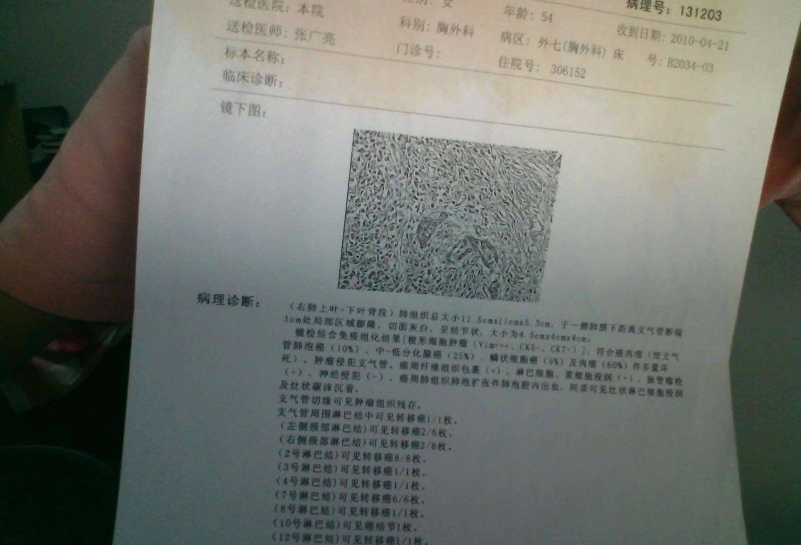 2、手术很顺利,但病理不理想,很恶性的肉瘤样癌(肉瘤 腺癌 鳞癌 大细胞癌 支气管肺泡癌)