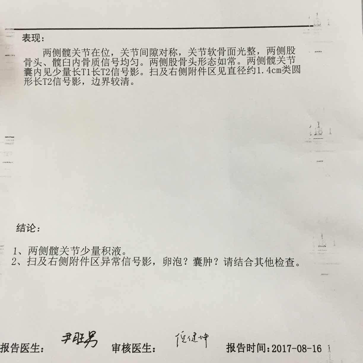 痛的大半个月了,每天都像针扎一样痛的了,等了几天终于出来了,一直担心骨坏了,但还好没坏,是有积液,还有个异常信号影医生说是妇科上的,大家帮我看看,有人跟我一样吗?卵泡和囊肿严重吗?医生也没开药,可是腿还是痛啊