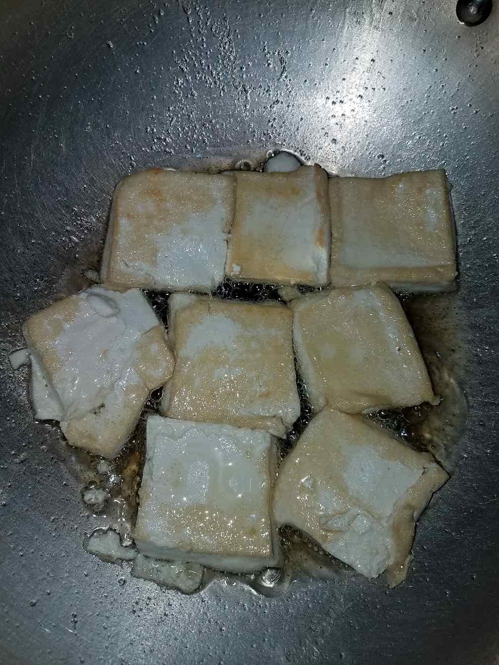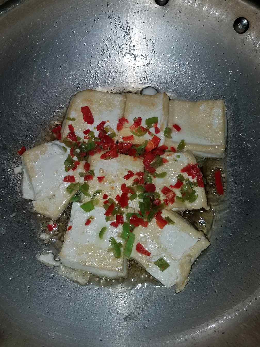 2:锅里热油,把豆腐放下去,中小火慢煎,加入盐,煎到两面金黄色。
