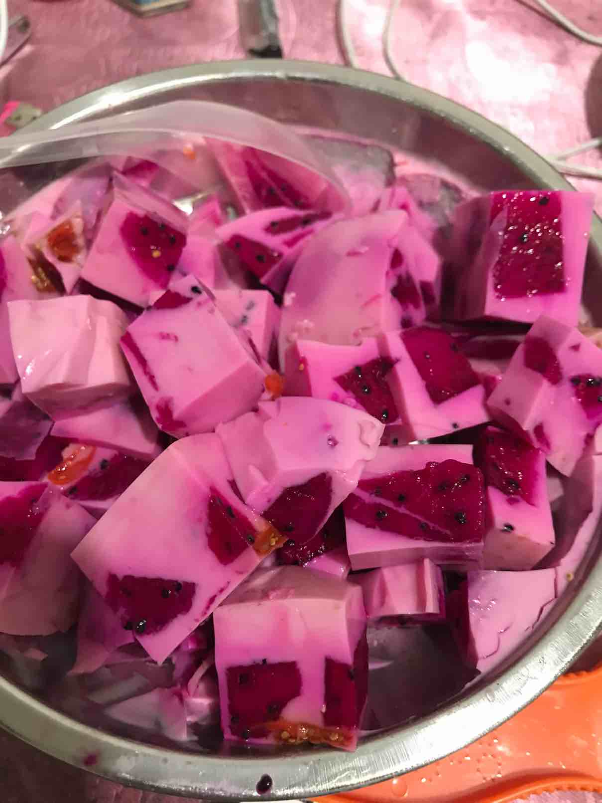 昨天晚上牛奶放多了,喝不完。好吧。那就换个吃法,做鱼胶冻火龙果。红心的,做出来的效果真好呀。视觉效果也好,味道也好。就是有点冰。