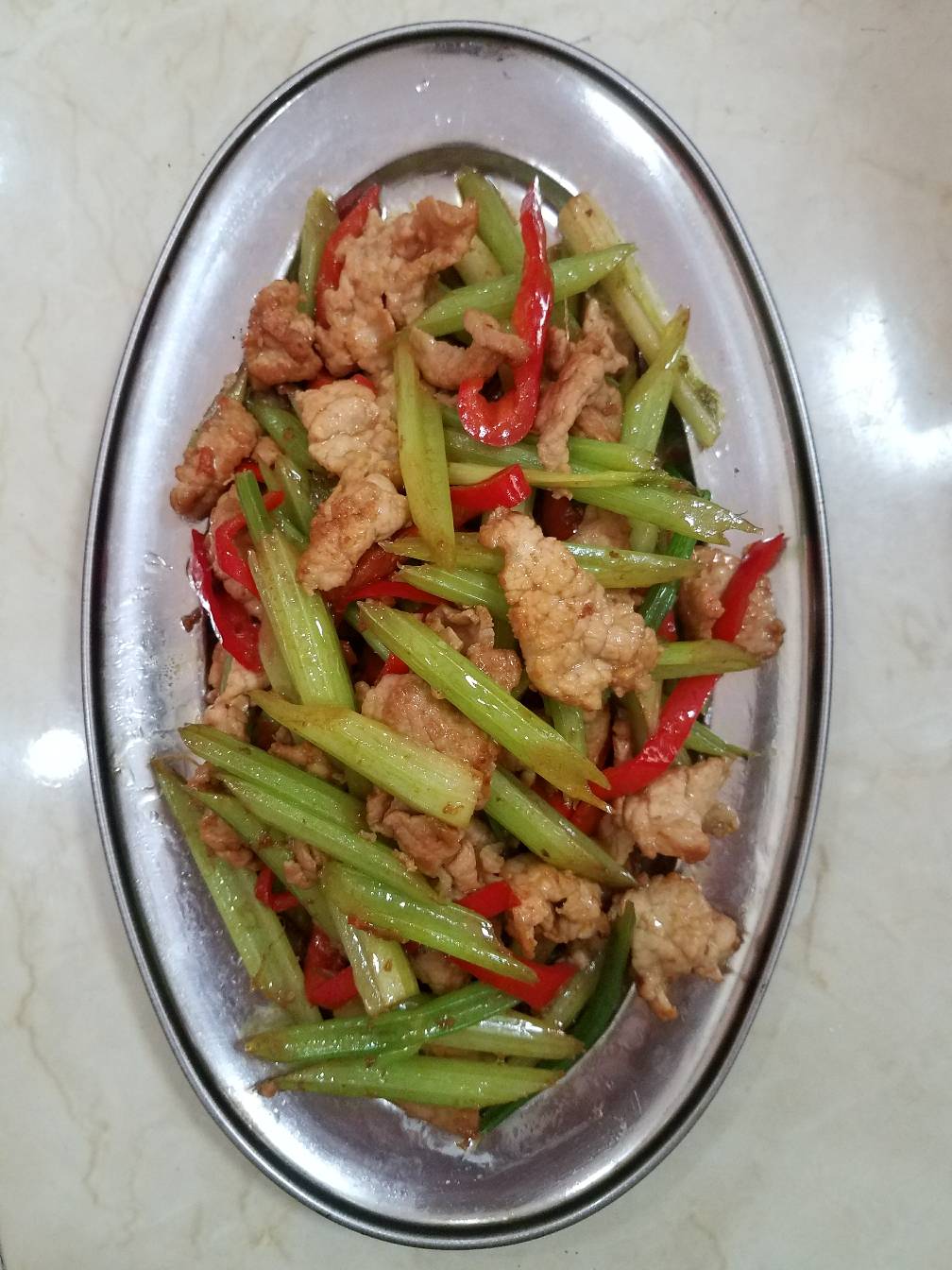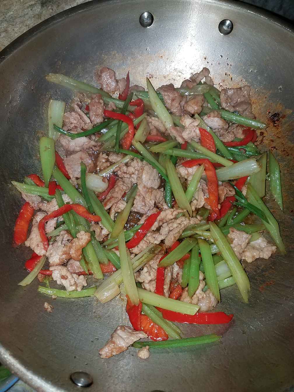4:锅里热油,把瘦肉倒下去翻炒片刻,加点酱油和水,再把刚才的辣椒和芹菜倒进去一起翻炒,然后出锅。