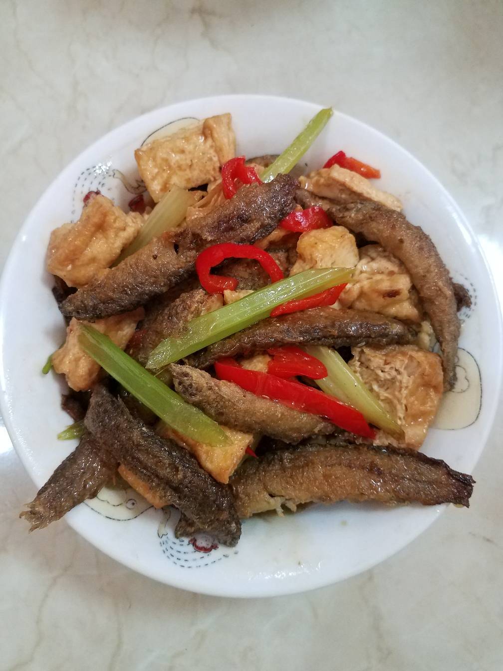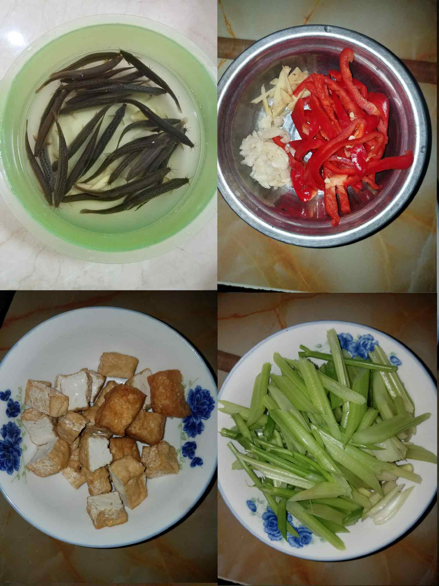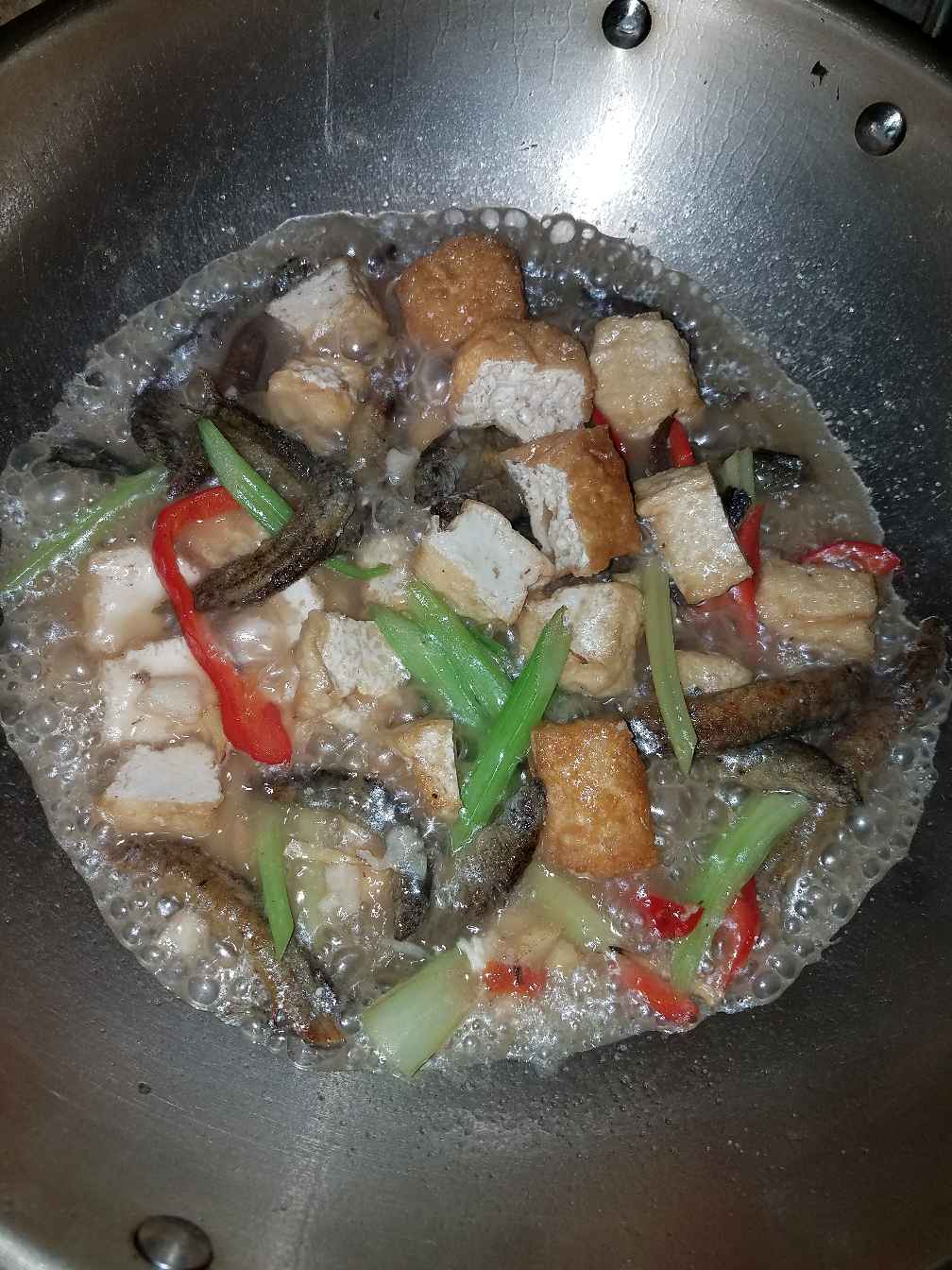 4:锅里热油,把姜蒜放下去爆香,再倒入油豆腐和泥鳅,辣椒(我还加了一点芹菜)翻炒片刻,再倒入水,水开了后加入盐,酱油,蚝油, 焖上10分钟。