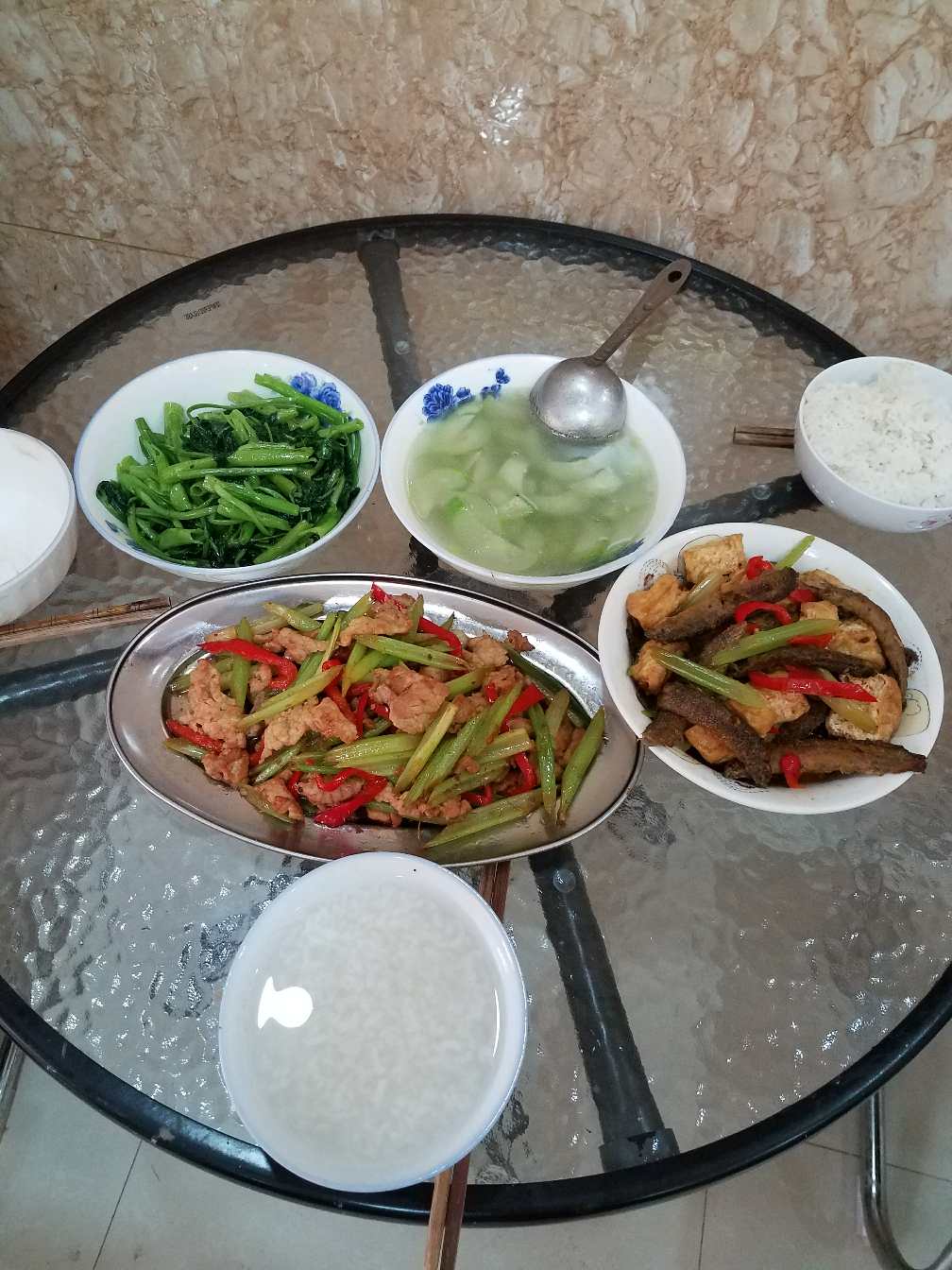 今天午餐吃的菜是:芹菜炒瘦肉,泥鳅焖豆腐,炒空心菜,丝瓜汤。