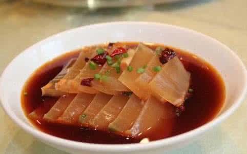 这个是我们家吃的,成冻之后切成块就好了,我们平时都是直接在盆里划几刀,直接夹起来吃,w为了拍照好看,特地切成一小块装盘了,虽然说不能吃辣,但是一点辣味没有又不好吃,所以在他接受范围之内放了一点点酱油辣子。当成是小菜吃也很不错了。