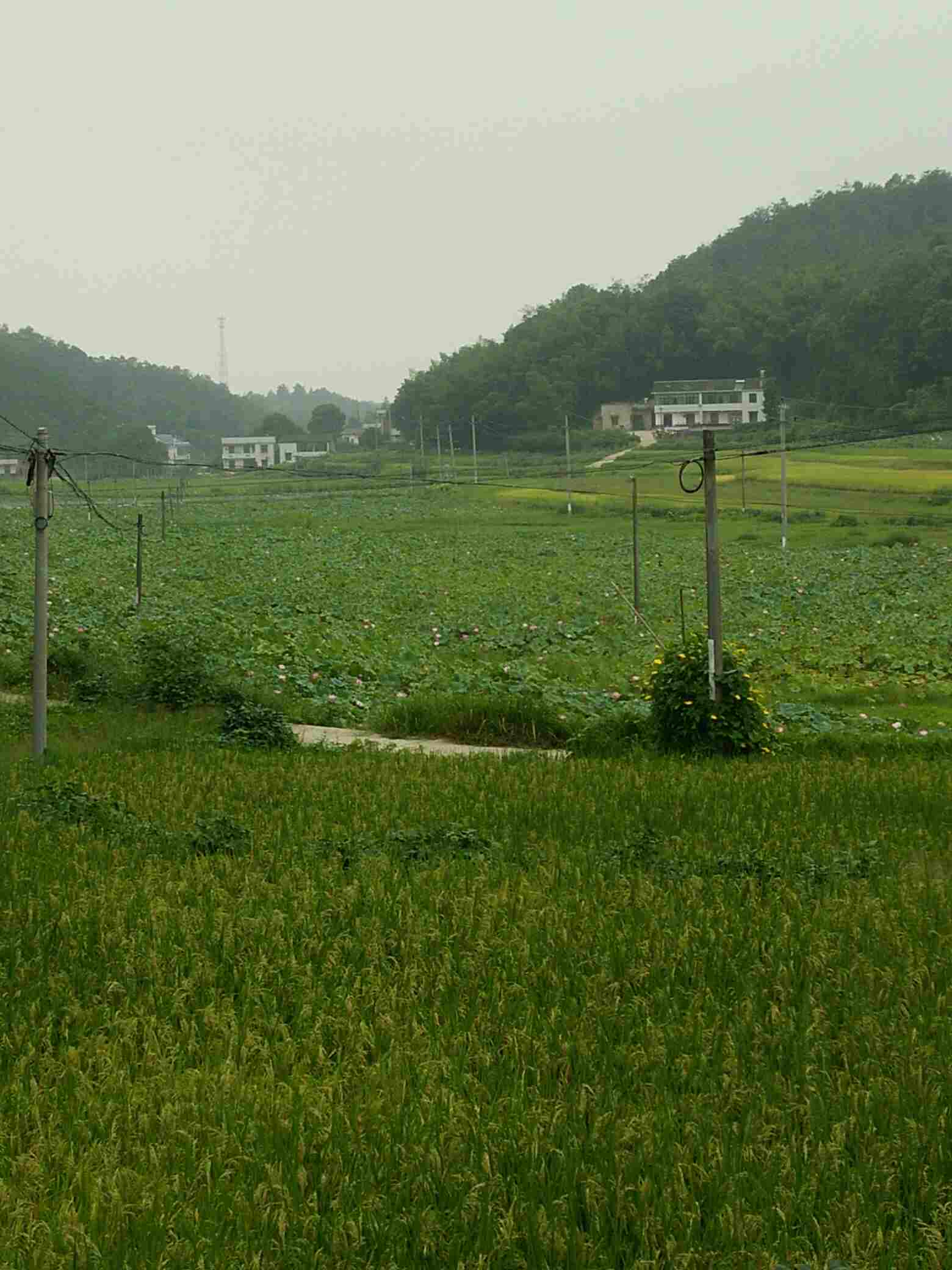 早上起来去鱼塘钓了两条鱼,呼吸了新鲜的含氧高的空气!回来老公在挖土准备种上有机菜,突然觉得农村也挺好的,屋门口是公路,公路旁是一望无际的莲田,孩子在嬉戏!