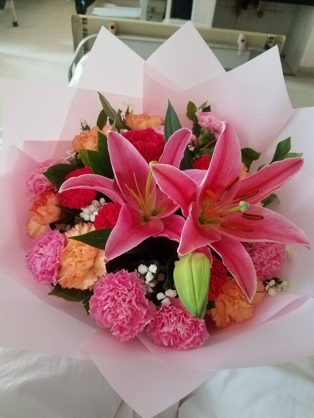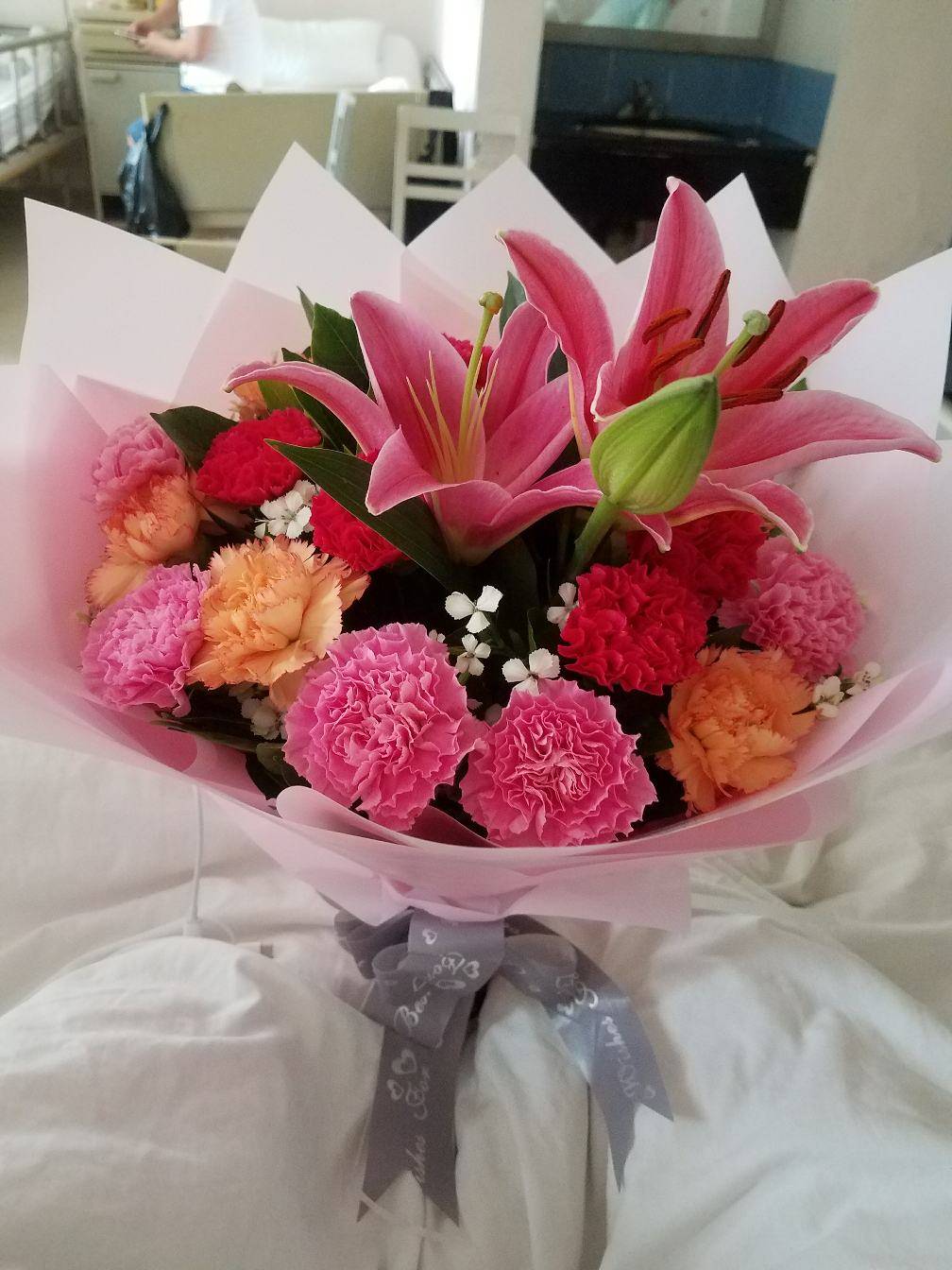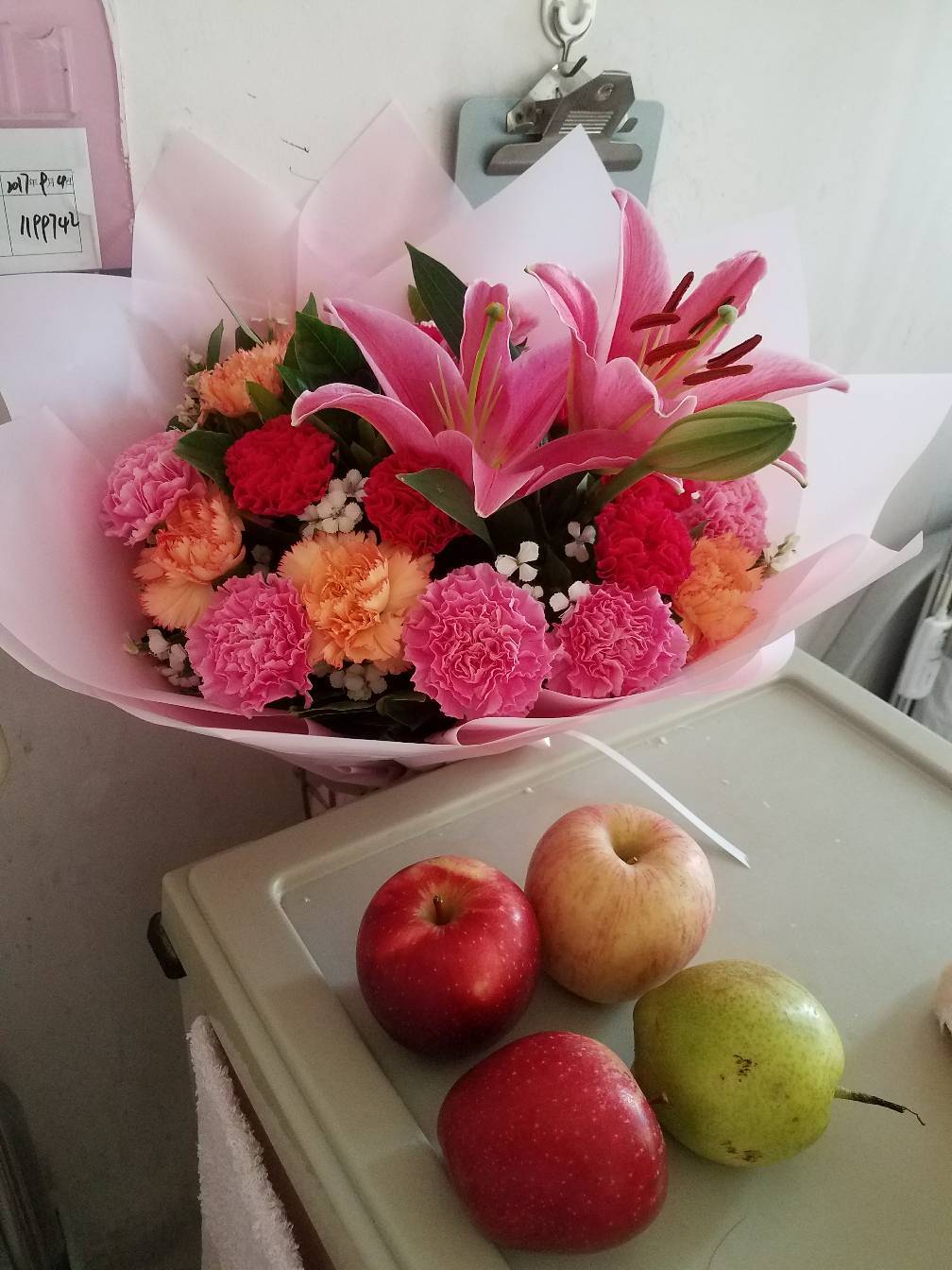 而且她们今天也要出院了,都各自给我送上苹果,还有旁边床的那位姐姐送我的花(好漂亮😍)说祝我手术一切顺利,愿我生一个白白胖胖的宝宝!真的非常感谢她们,愿她们好人一生平安!