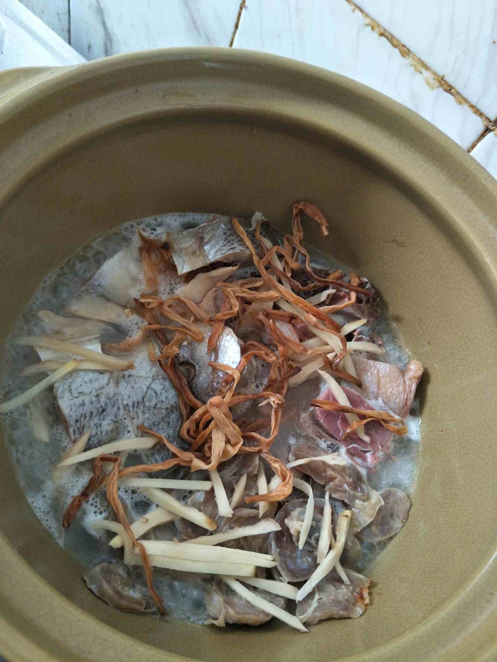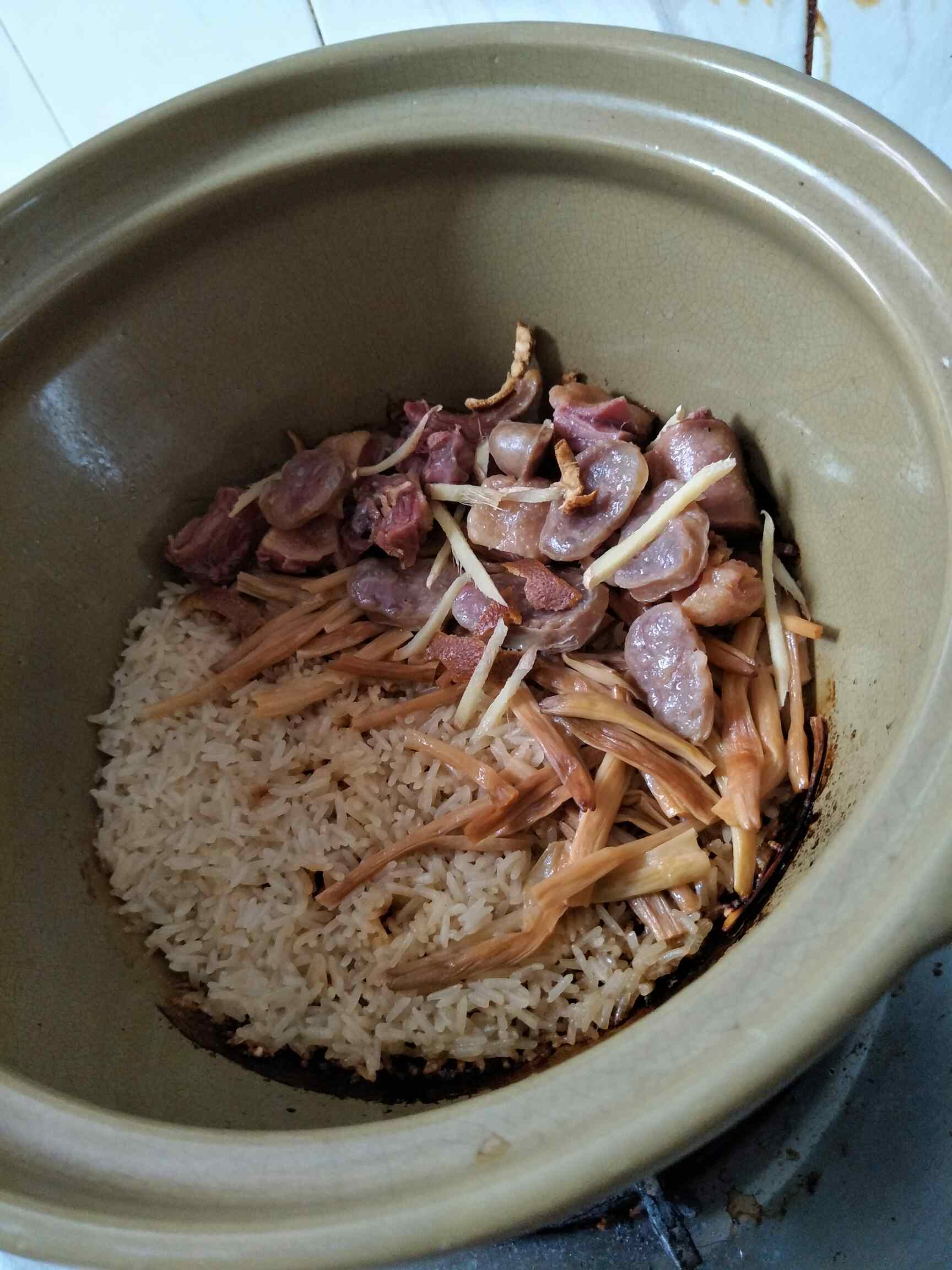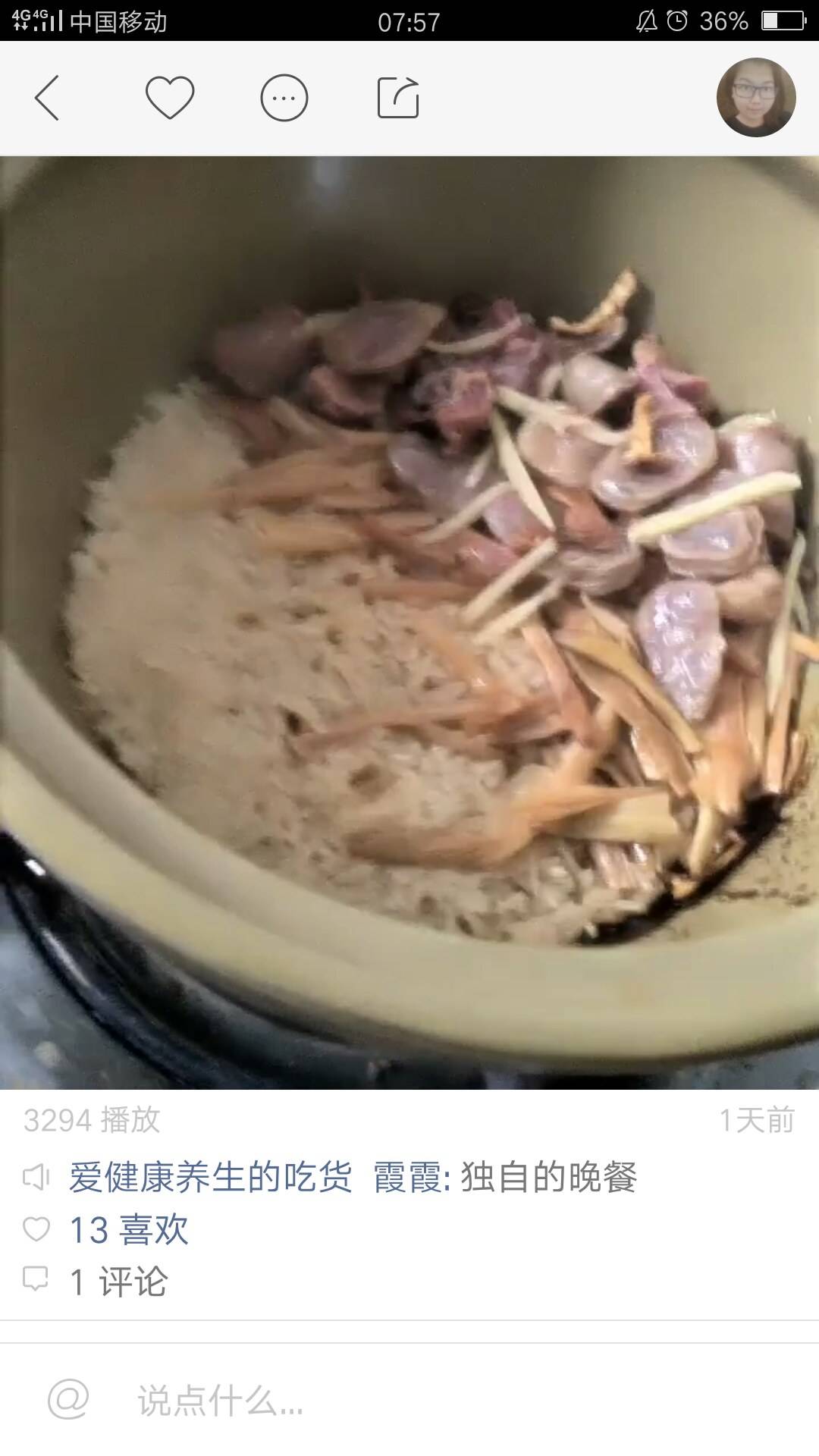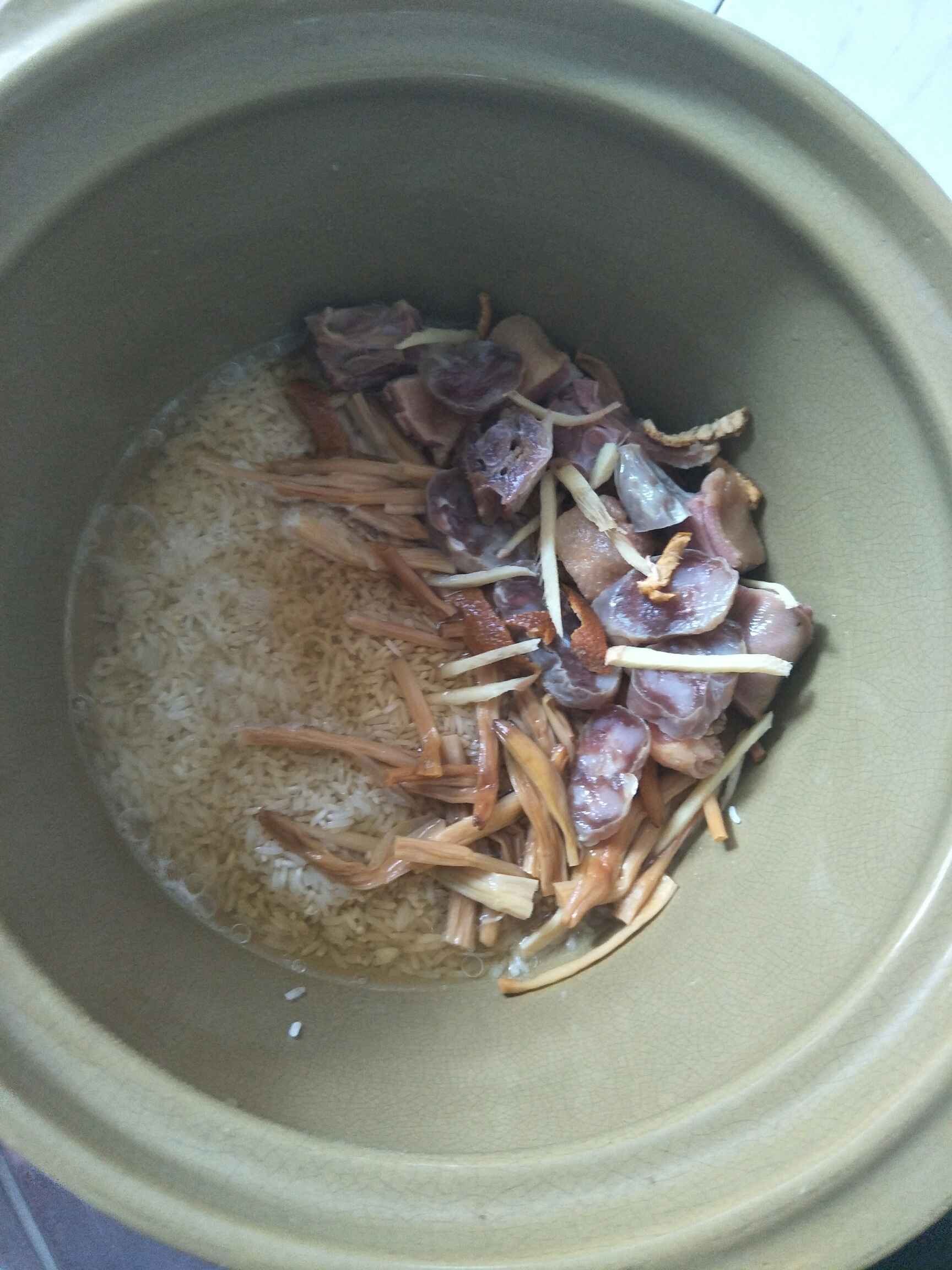 先在煲里刷一层油,然后在把洗好泡过的米放入煲里,加入水,然后,再把食材,放入煲里(这个是水开了才放的)看材料,如果是难熟的就先放,😊我用的是腊味,我就先放了,加了些姜丝!!